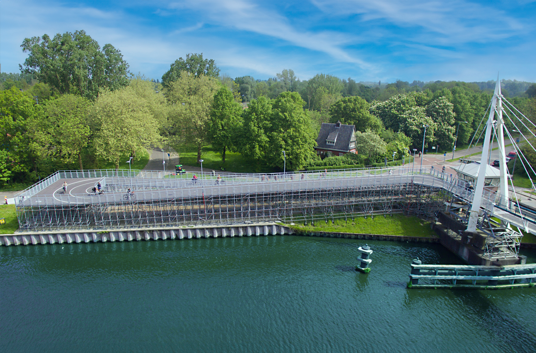 Nachdem ein Schiff mit einer niederländischen Brücke für Fahrradfahrer kollidiert war, mussten die Radler für mehrere Jahre auf eine deutlich höher gelegene Fußgängerbrücke ausweichen. Da der Zugang über deren Treppe äußerst beschwerlich gewesen wäre, errichtete Stageco zwei temporäre Rampen mit ungefähr 150 m Länge und rund 5 m Breite. Mit dem flexiblen AllroundGerüst ließen sich die beiden Rampen nicht nur exakt an die geforderten Abmessungen, die gewünschte Steigung sowie den abschüssigen Untergrund anpassen, sondern auch an die Platzierung der über 8 m tiefen Bodenverankerungen in Ufernähe. Eine sichere Nutzung war ebenfalls sichergestellt: Allround-Ergänzungsbauteile wie kindersichere Geländer sind serienmäßig erhältlich. Eine Lösung mit System.