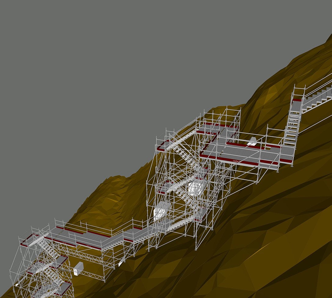 - Detaillierte Vorplanung in 3D mithilfe von LayPLAN CAD – so konnte die temporäre Gerüst-Treppenanlage genau an die Gegebenheiten angepasst und trotzdem materialsparend umgesetzt werden