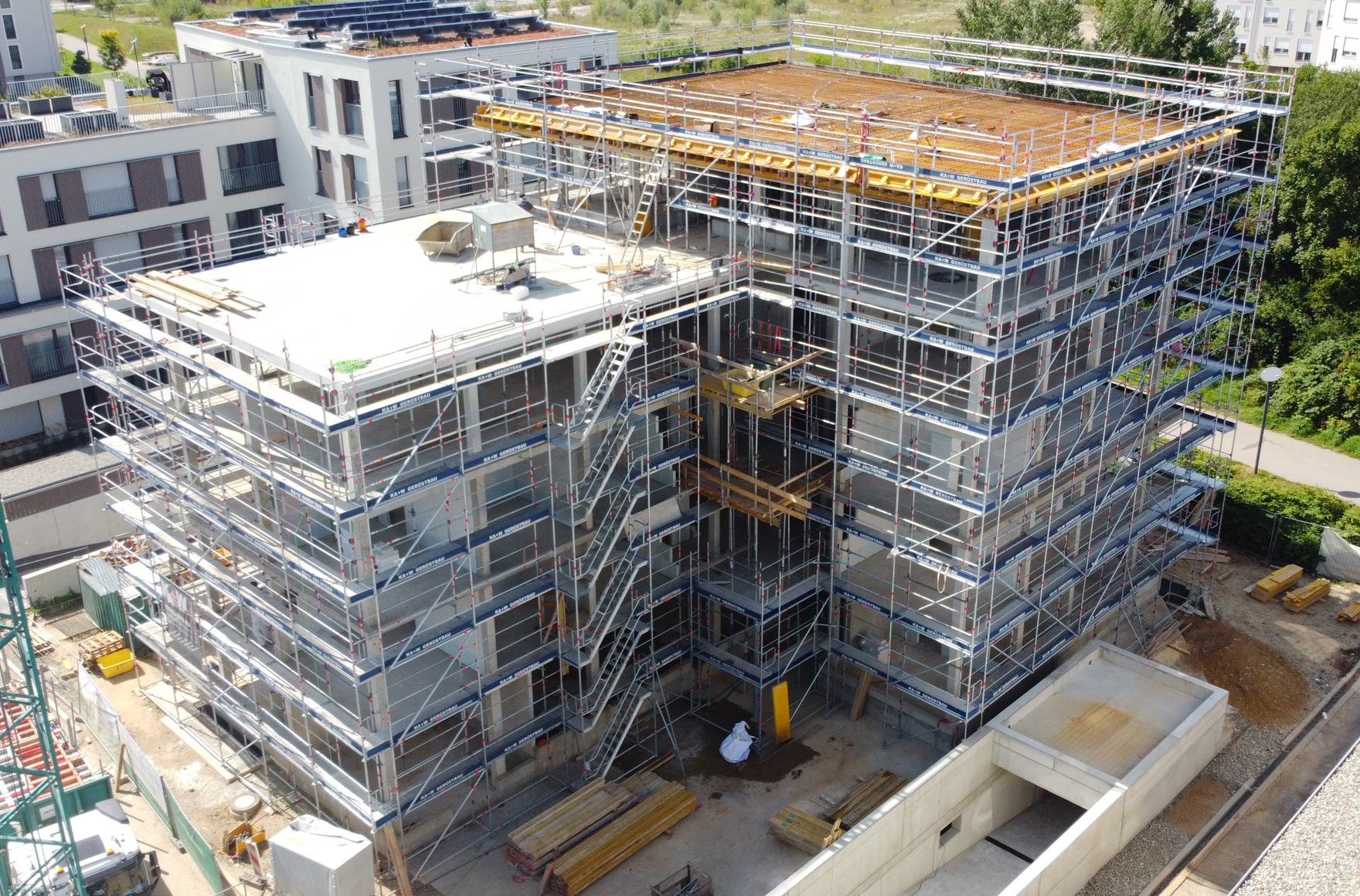 Die Errichtung eines Wohnkomplexes in Holz-Hybrid-Bauweise machte während der Rohbauarbeiten ein Schutzgerüst notwendig. Dieses sollte abschnittsweise mit Baufortschritt errichtet werden. Das modulare Fassadengerüst AGS sorgte dabei nicht nur für eine schnelle Montage und Demontage, sondern auch für einen zweiteilig vorlaufenden Seitenschutz – innen wie außen. Ein AGS-Podesttreppenturm gewährleistete zudem den schnellen und sicheren Aufstieg im Gerüst. Selbst mit Arbeitsmaterial. Eine Lösung mit System.