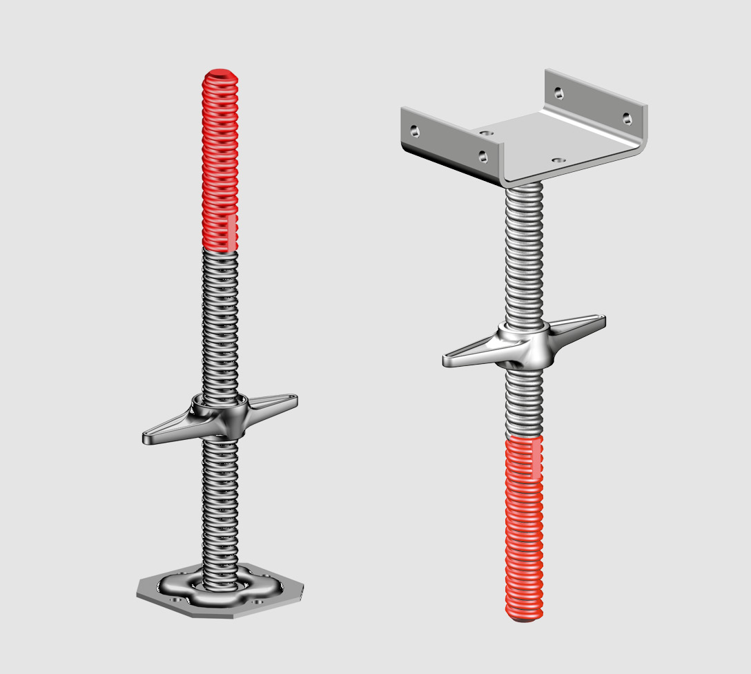 Layher bietet Ihnen ein vollständiges Programm an Fuß- und Kopfspindeln inklusive Unterlage- und Ausgleichsplatten an.