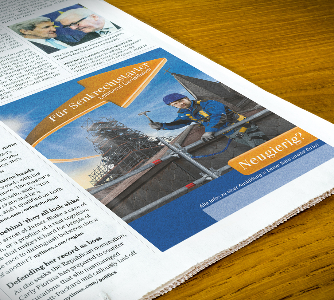 Um dieses Ziel mit unseren Kunden zu verwirklichen, haben wir eine Imagekampagne für das Gerüstbau-Handwerk ausgearbeitet und stellen Ihnen diese zur Verfügung. Denn nur durch eine gemeinsame flächendeckende und kontinuierliche Kommunikation können wir die Bekanntheit des Gerüstbau-Handwerks dauerhaft steigern.