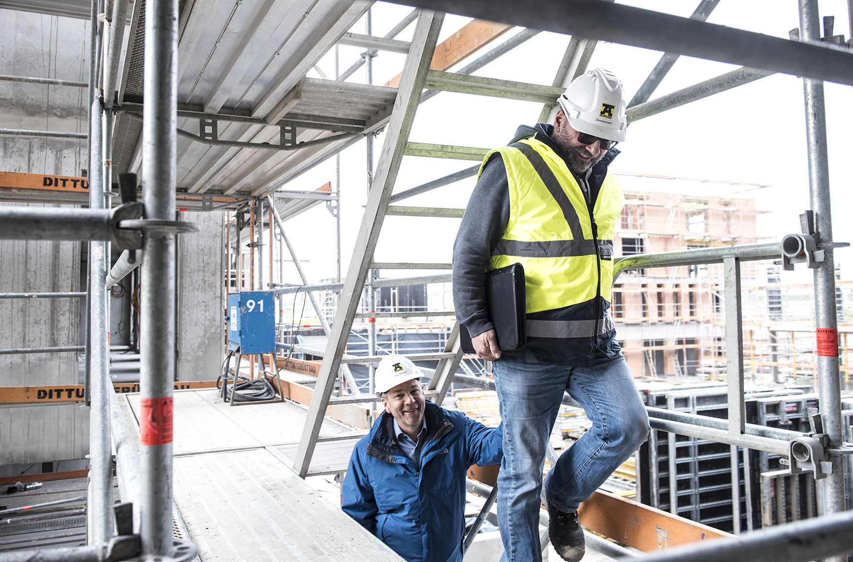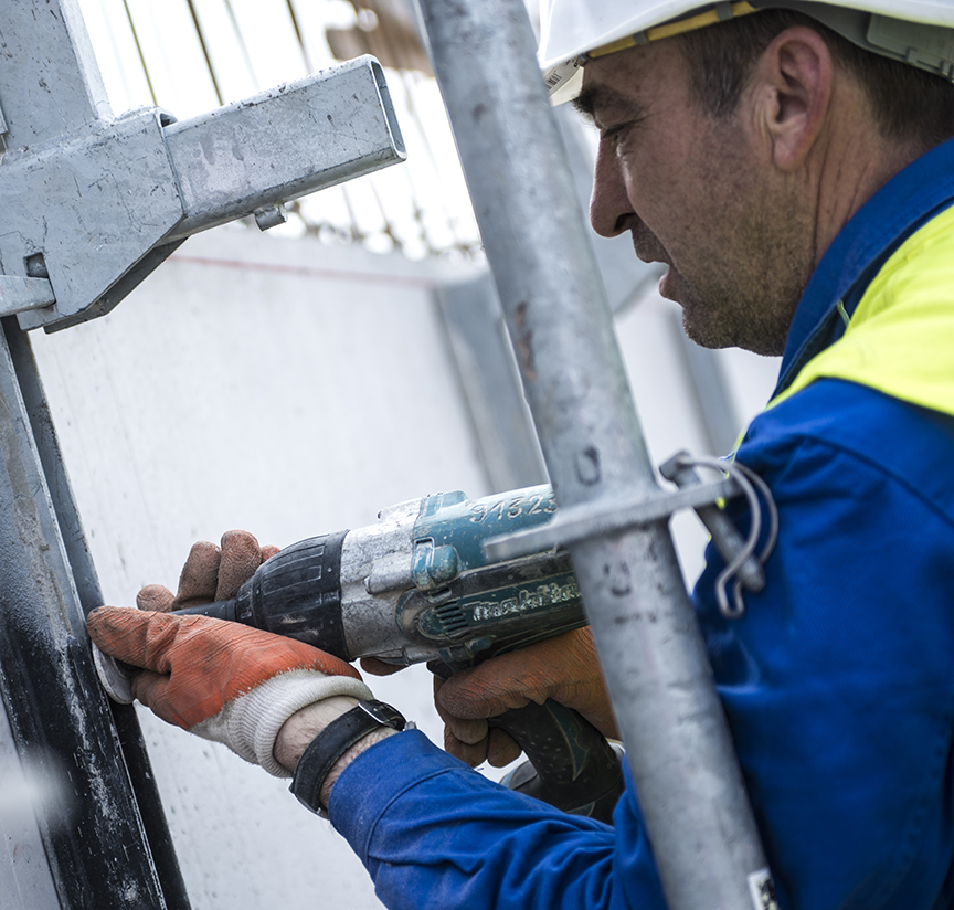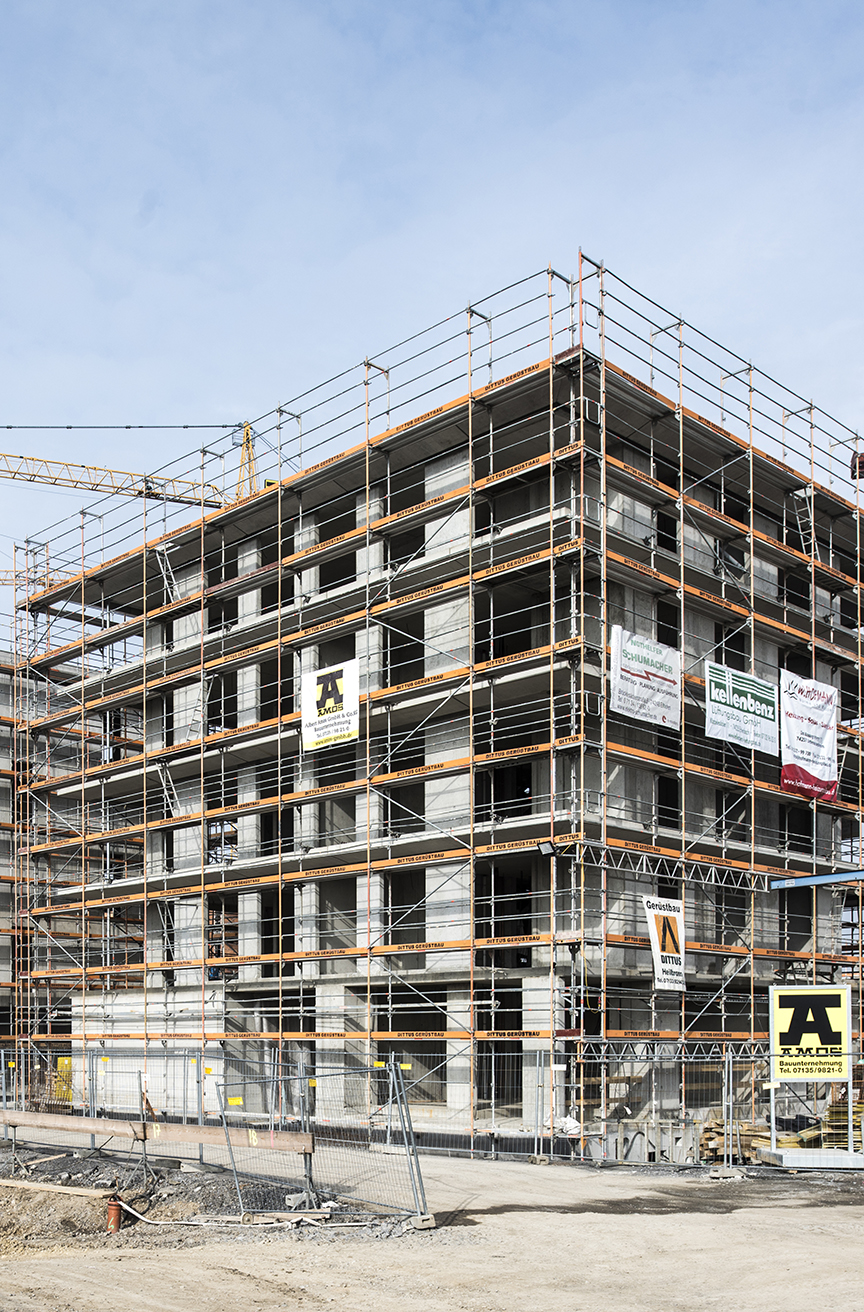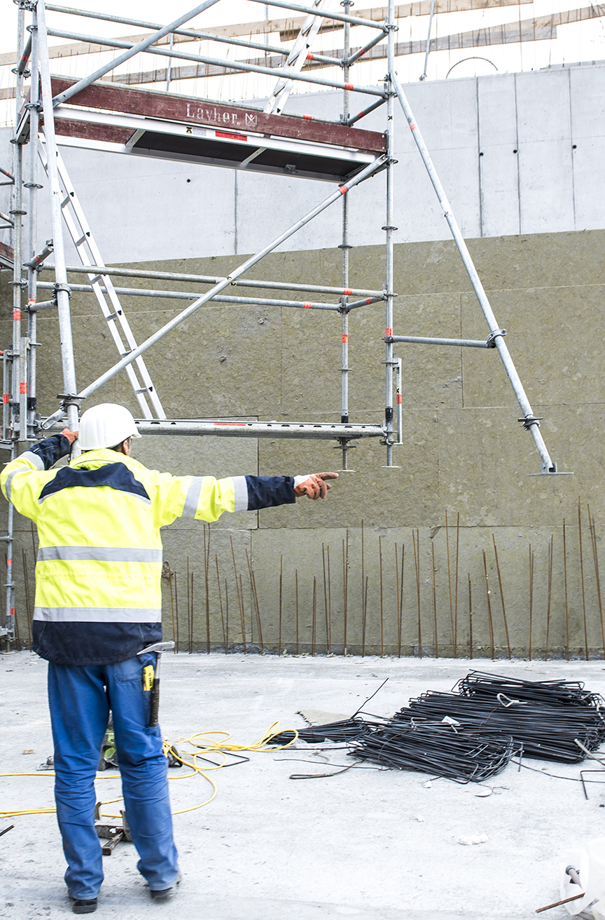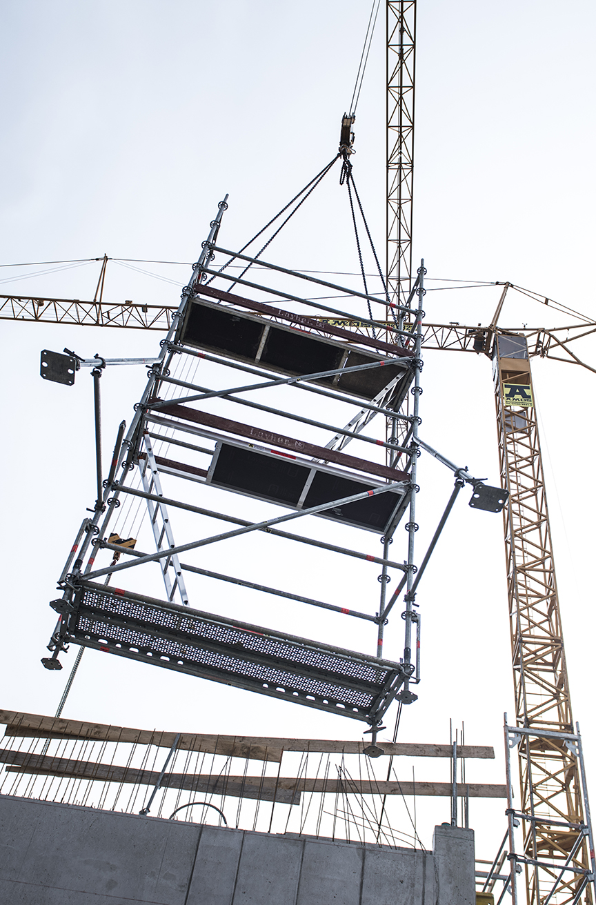 Neben dem wirtschaftlichen Vorteil schätzt Oberbauleiter Zimmermann vor allem die Qualität und Kompatibilität, gerade bei Gebäuden die besondere Ansprüche erfüllen sollen. „Wir nutzen unser Layher Allround-Material im Bauprozess vor allem für den flexiblen und sicheren Zugang zu Arbeitsbereichen, die nicht ohne weiteres zu erreichen sind.“ Der großen Verantwortung für seine Mitarbeiter ist sich Horst Zimmermann bewusst, und genau deshalb baut er auf Layher Material. „Der unkomplizierte Aufbau der Gerüstelemente spart Zeit und ist auch an ungewöhnlicher Gebäudegeometrie einsetzbar.“ Für die Montage der Layher Abschalkonsolen an einem Bauabschnitt errichtet Amos mit seinem Allround Material z.B. ein gut vier Meter hohes, freistehendes Gerüst, das mittels Kran sehr unkompliziert an die passende Stelle befördert werden kann. „So arbeiten unsere Mitarbeiter ganz standsicher auch in größeren Höhen und können sich voll auf die Qualität ihrer Arbeit konzentrieren – lästiges Auf- und Abbauen entfällt.