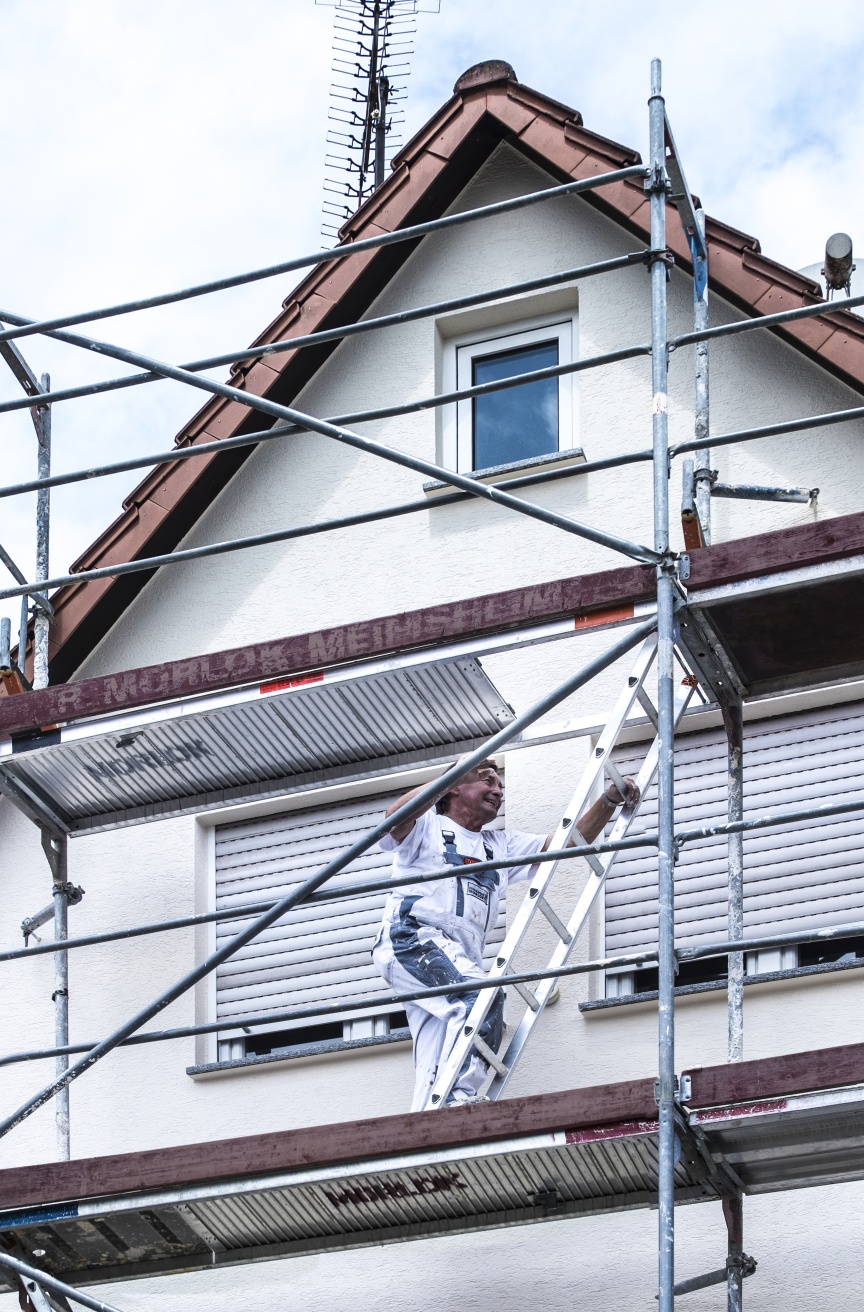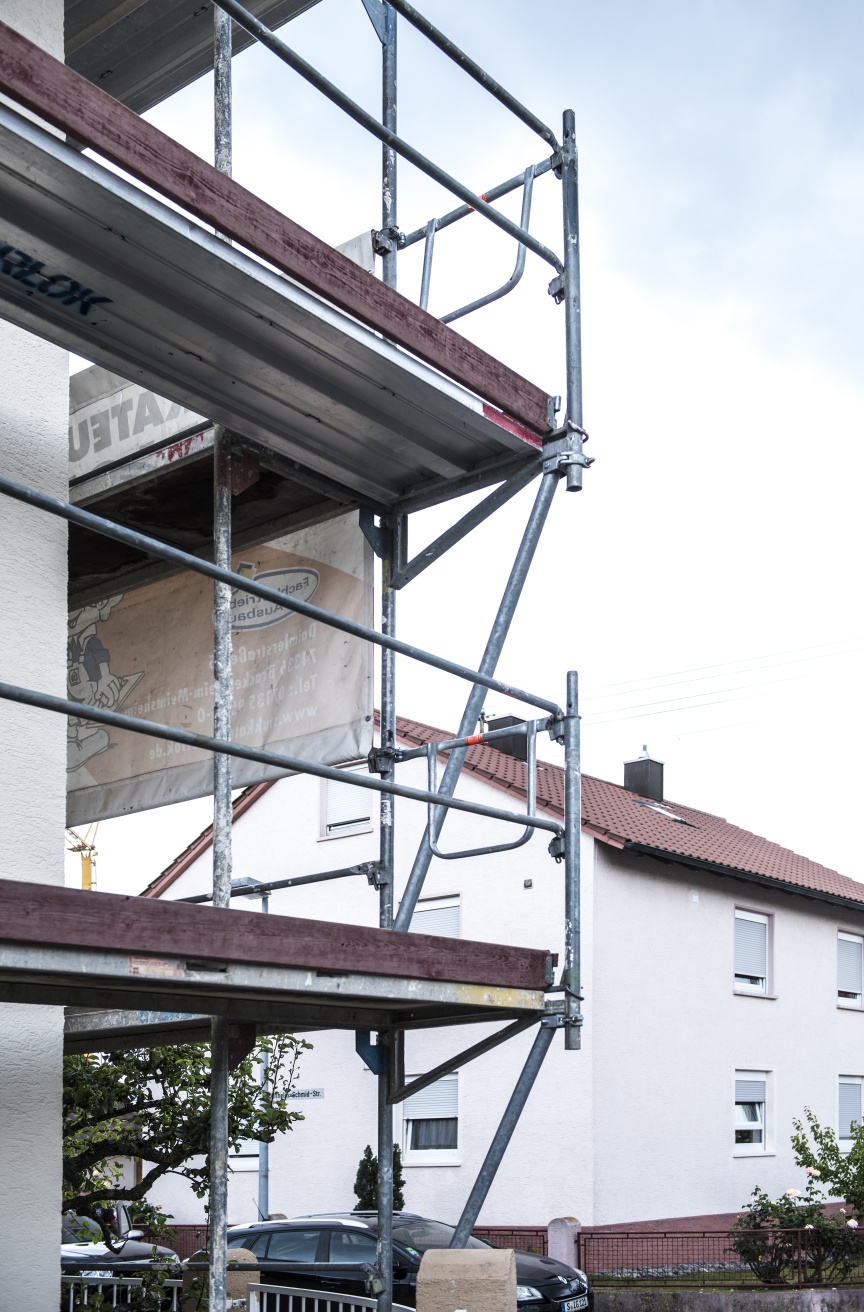 Seine erfahrenen Mitarbeiter bauen vor Ort das Gerüst auf und können durch das einfache Prinzip des führenden Steckrahmengerüsts und die für das Layher BlitzGerüst verfügbaren Ausbauteile problemlos auf die Gegebenheiten vor Ort reagieren. Leichte, einteilige Böden, auch aus Aluminium, erleichtern dabei sowohl den Transport wie den Aufbau. Mit nur sechs Grundelementen und wenigen Handgriffen ist dieses Gerüst in logisch-sicherer Aufbaufolge schnell und schraubenlos montiert. Beim aktuellen Projekt eines Mehrfamilienhauses wurden die knapp 650 m2 Fassadengerüst von 3 Mitarbeitern in gut 2 Tagen gestellt. Es kamen auch Durchstiege mit intergierten Leitern für den sicheren Aufstieg sowie überlange Böden zum Einsatz, um eine Garageneinfahrt auch während der Sanierungsarbeiten befahren zu können. Weitere Konsolen helfen den großen Dachvorsprung passend einzurüsten.