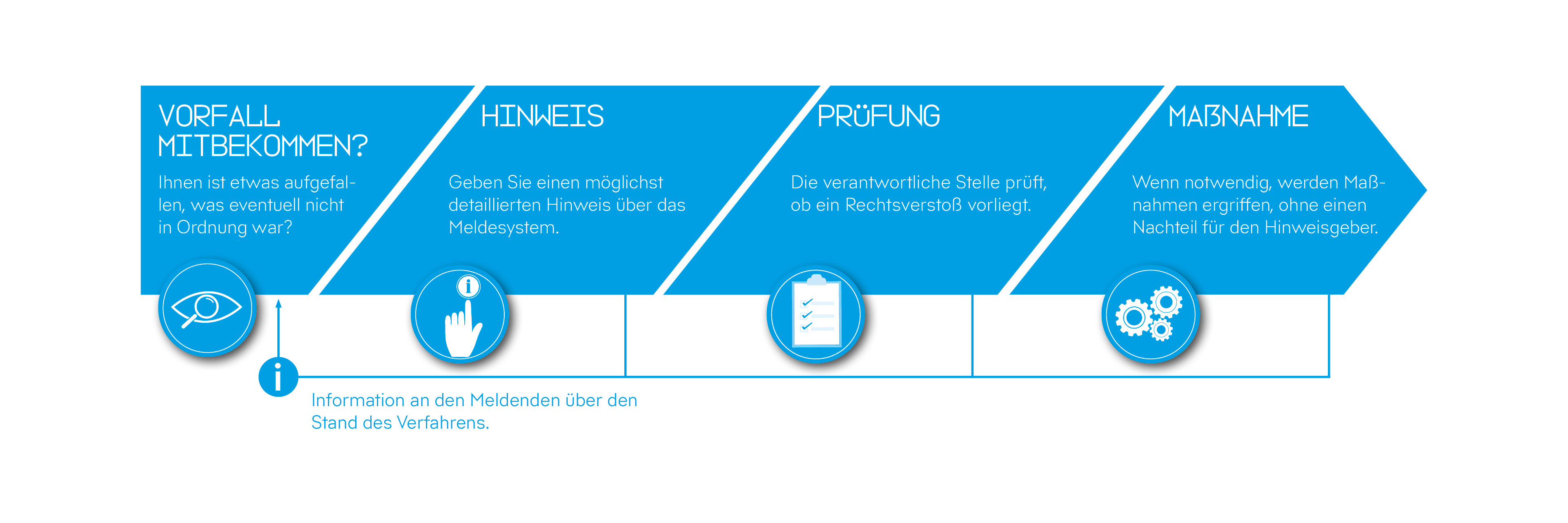 In unserem Meldesystem sollen Verstöße gegen Gesetze und Vorschriften sowie schwerwiegende Verstöße gegen unseren internen Anweisungen und Vorgaben gemeldet werden. Im Rahmen des Meldesystems werden Sie als Meldende über den Stand des Verfahrens informiert.