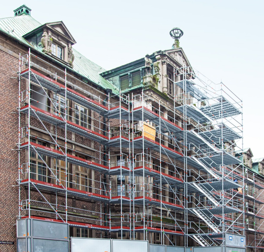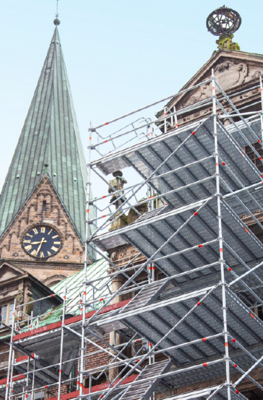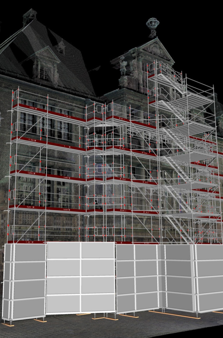 When buildings like Bremen’s City Hall have been regularly added to or converted and extended over the centuries, meaningful blueprints are mostly non-existent. The ability to survey structures in great detail by taking a 3D laser scan and using it as the basis for efficient digital scaffolding planning considerably simplifies the overall process. “In the meantime, scaffolding is to a large extent civil engineering through and through. It involves a lot of structural analysis, which is why we need reliable plans, flexible scaffolding material and strong partners. As a satisfied Layher customer, we benefit enormously from the broad idea underlying the Integrated System and the wide range of services on offer, which constantly make more and more things
