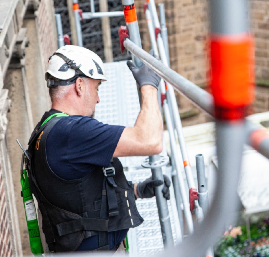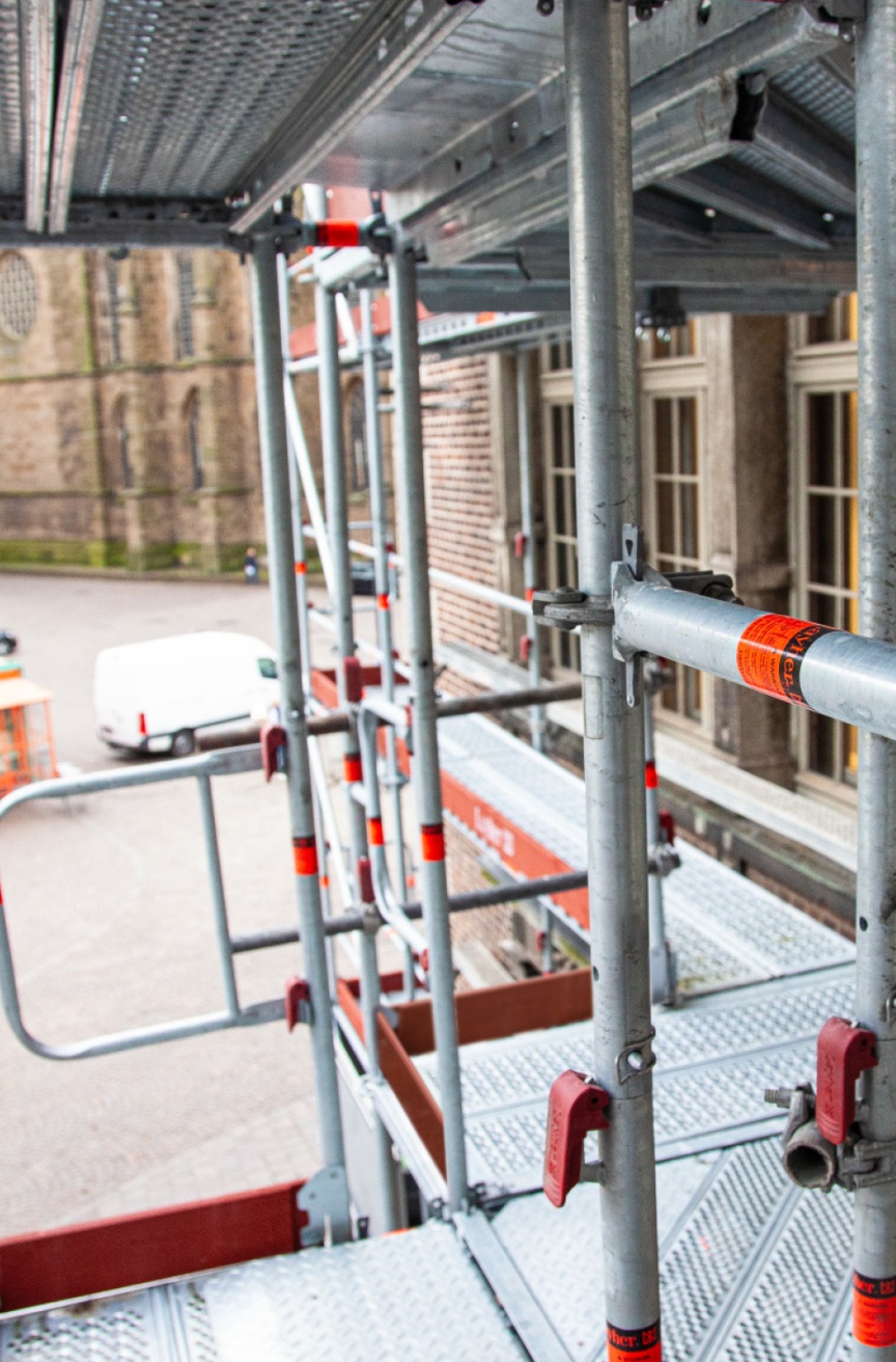 “This construction site at the historic City Hall was our first time using the AGS System. We wanted to assemble the entire scaffolding from a secured level without any extra PPE. That is not only safer but also more efficient”, says Malik Tharia, Managing Director of Wilhelm Bädecker Gerüstbau GmbH. The three-strong construction crew erected the scaffolding, together with the associated Layher platform stairtower and the loading platform made from Allround material, little by little over a four-week period, so that the restorers could start work on one side while the scaffolding was still going up elsewhere. For the new AGS System, this was a great chance to show off what it can do at a location steeped in history.