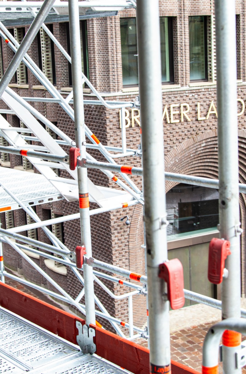 The new AGS System consists of an AGS standard and an AGS guardrail, which are installed from a secured level. Two different types of guardrail are employed in Bremen: the AGS guardrail Fixx, which cannot be removed when assembled, preventing unauthorised dismantling, and the AGS guardrail, which is removed by opening the levers at a defined point, making it easier for the various trades to transport material. The matching AGS double end guardrail can likewise be assembled quickly and easily from the secured level to secure the open ends without any additional bolting.