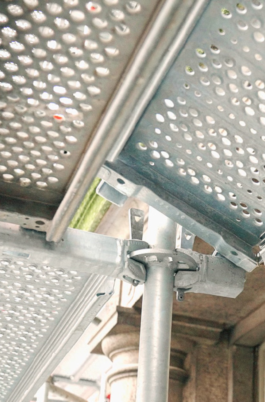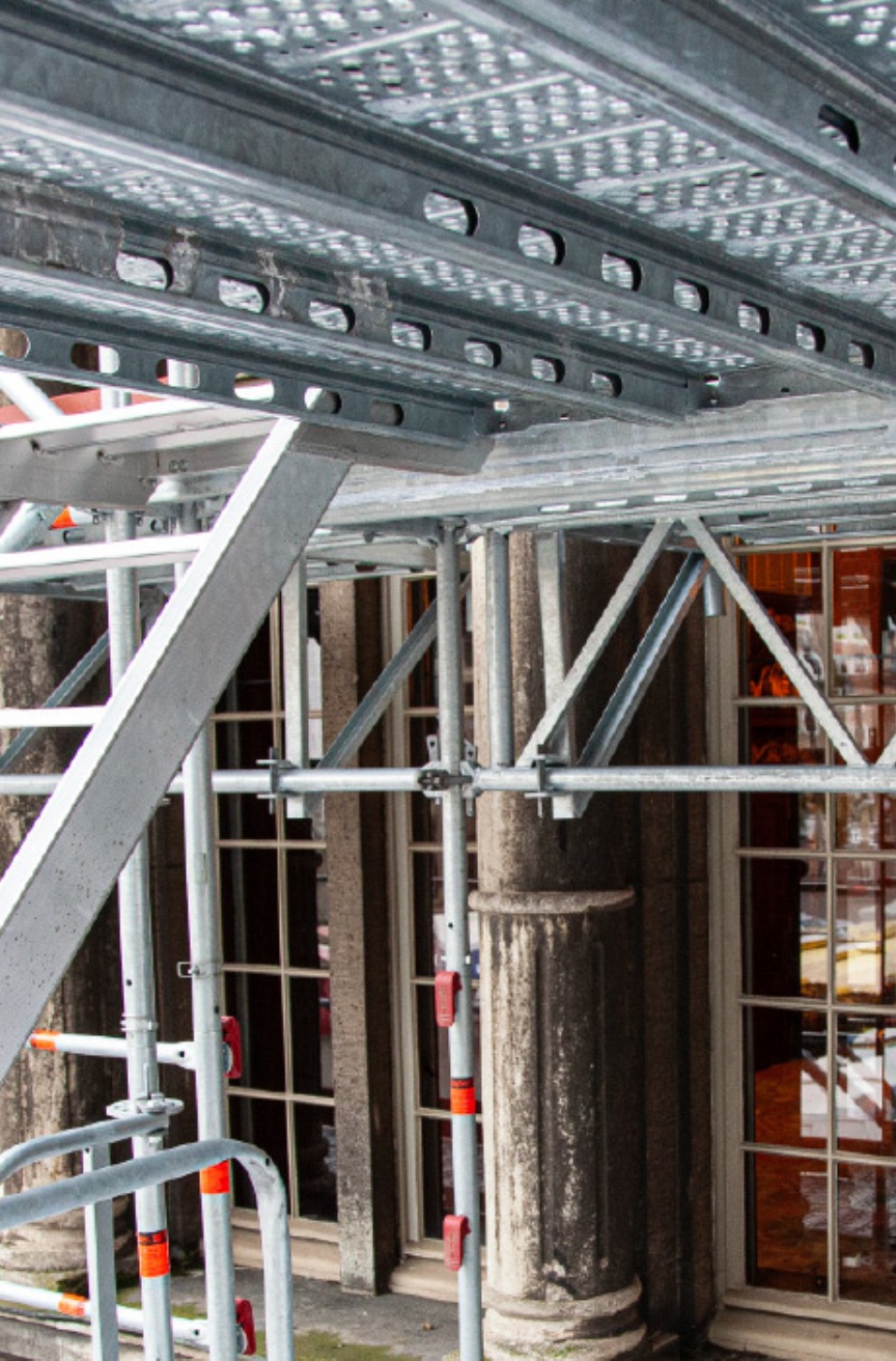 The AGS System is fully integrated into the Layher scaffolding system and is simple to combine with all standard Allround components. “In other words, we can incorporate our existing Allround material into the basic AGS structure flexibly and easily, for instance in order to close open corners with U-steel decks 45°, realise deck edges flush with the facade using TipTop brackets or scaffold recesses in the structure with larger U-console brackets. This flexibility is a hallmark of Layher Allround Scaffolding and it’s one main reason why we’re a satisfied and loyal Layher customer”, Tharia comments. Owing to the building’s special location and immense importance, the bottom four metres of the scaffolding are completely clad with Layher Protect cassettes to prevent unauthorised access to the construction site.