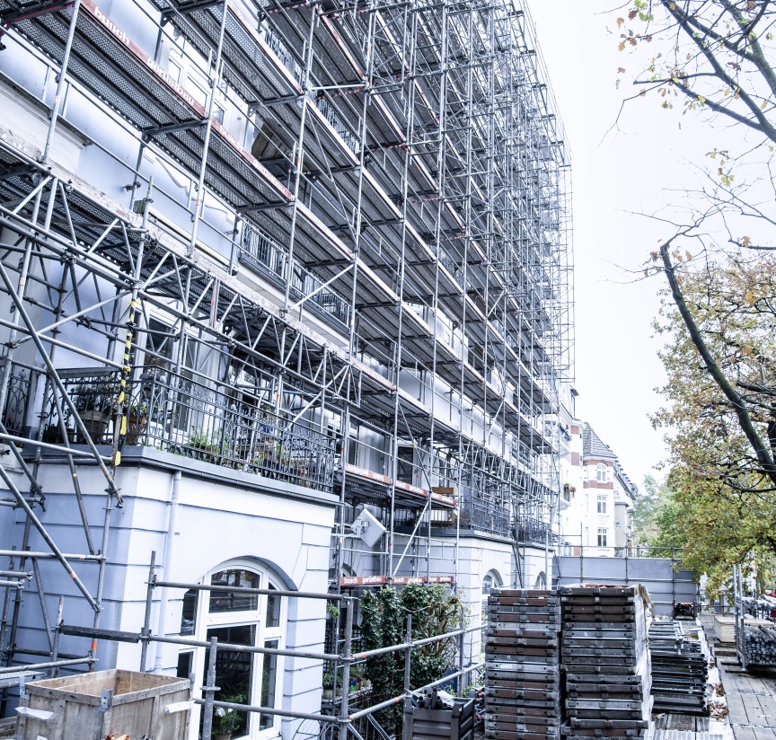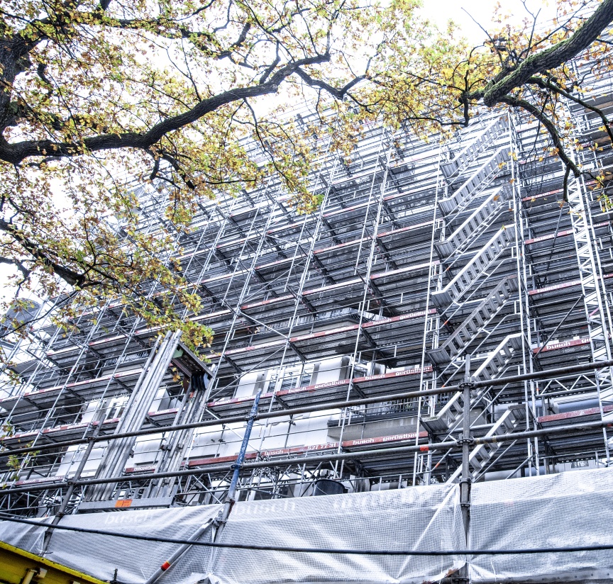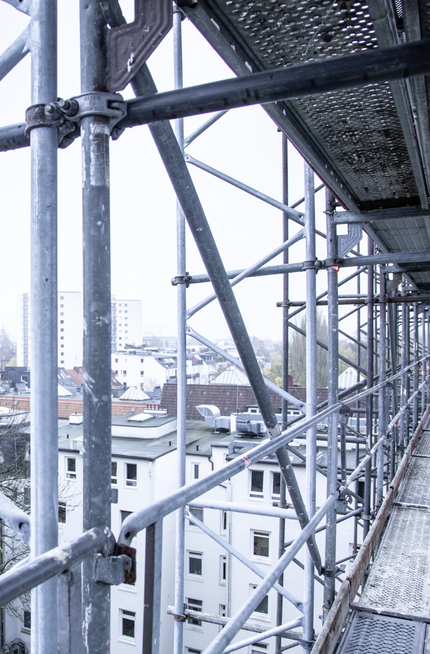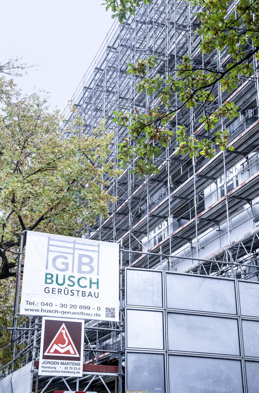 “We need facade scaffolding and a Keder Roof if we’re going to add an extra story to a building. What at first sounded like an everyday assignment over the phone became bigger and trickier by the day when it came to the planning and implementation”, explains Christopher Busch, Managing Director of the Hamburg scaffolding specialist of the same name. Sierichstraße – one of Hamburg’s busiest streets – had to be narrowed to a single lane in the area of the facade to make room for the crane and the construction site equipment. So as not to occupy more public space than absolutely necessary, the footpath was turned into a covered pedestrian tunnel using Layher Allround Scaffolding and Protect System elements. A 70 m long and up to 6 m wide platform was erected over it and also over the whole of the front garden. “Anyone who has ever passed by here during the rush hour will know that every inch of road is vital. That’s why covering over the garden completely was the best option. It means we can store all the required building materials temporarily without any problem during the 18-month construction period and reduce the disruption to traffic to a minimum”, adds Stefan Grasnick, the site supervisor responsible for the project.