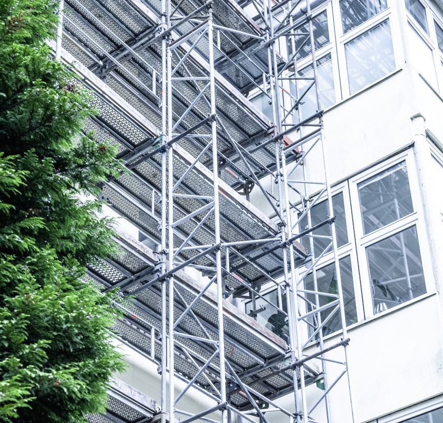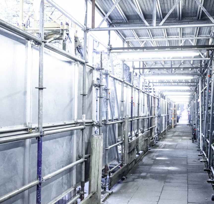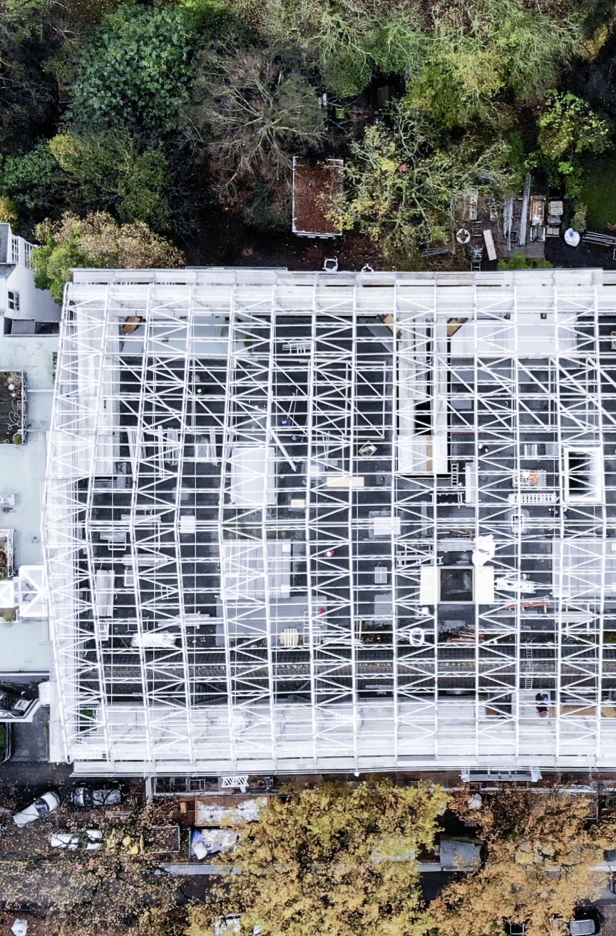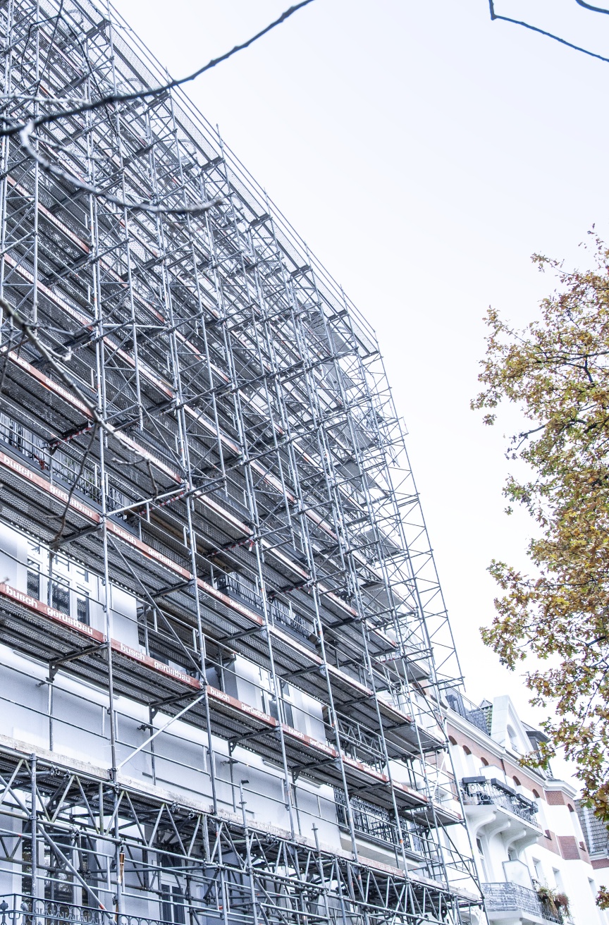 “We need facade scaffolding and a Keder Roof if we’re going to add an extra story to a building. What at first sounded like an everyday assignment over the phone became bigger and trickier by the day when it came to the planning and implementation”, explains Christopher Busch, Managing Director of the Hamburg scaffolding specialist of the same name. Sierichstraße – one of Hamburg’s busiest streets – had to be narrowed to a single lane in the area of the facade to make room for the crane and the construction site equipment. So as not to occupy more public space than absolutely necessary, the footpath was turned into a covered pedestrian tunnel using Layher Allround Scaffolding and Protect System elements. A 70 m long and up to 6 m wide platform was erected over it and also over the whole of the front garden. “Anyone who has ever passed by here during the rush hour will know that every inch of road is vital. That’s why covering over the garden completely was the best option. It means we can store all the required building materials temporarily without any problem during the 18-month construction period and reduce the disruption to traffic to a minimum”, adds Stefan Grasnick, the site supervisor responsible for the project.