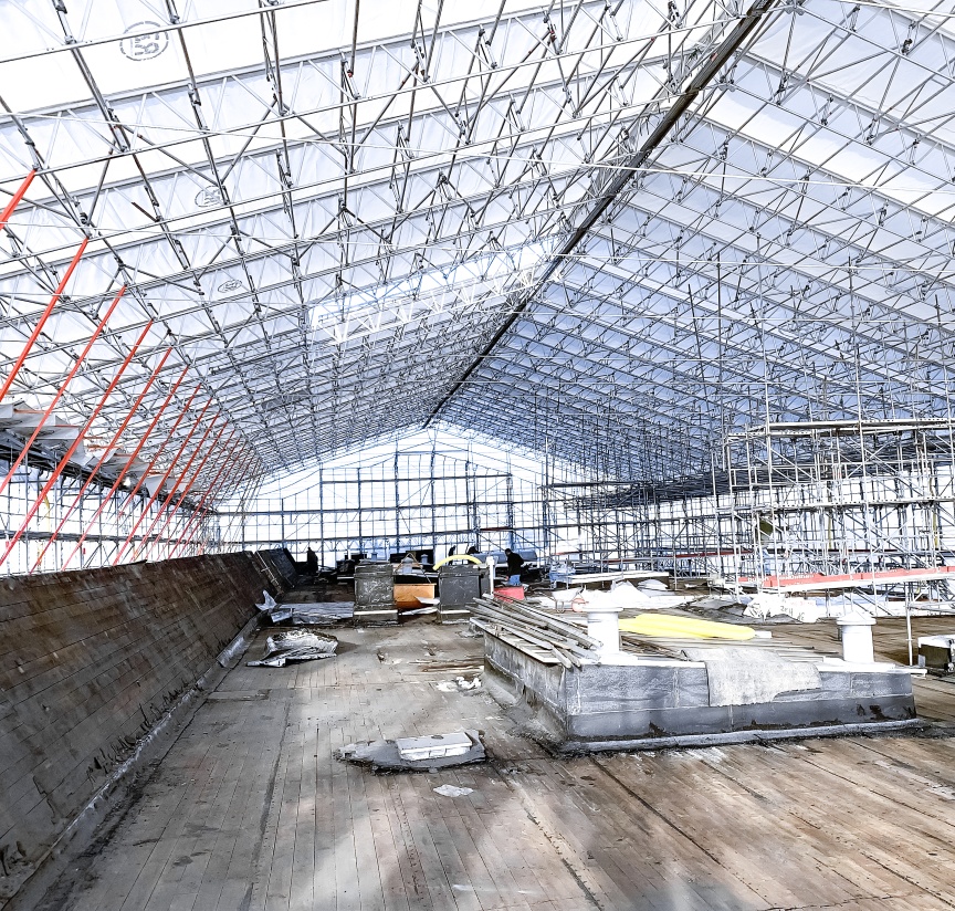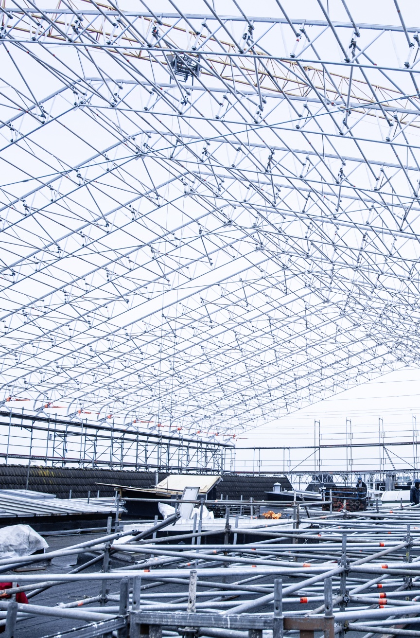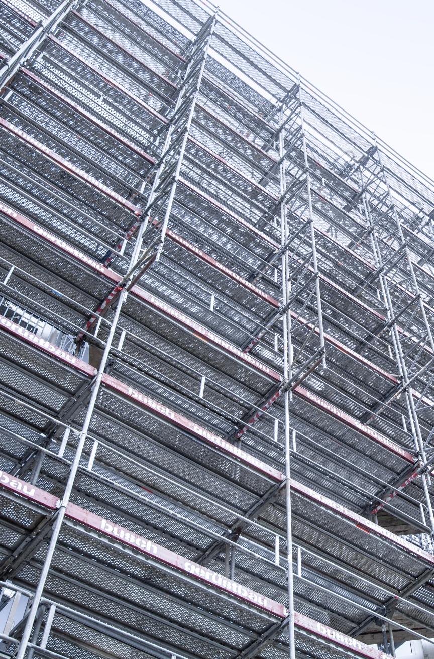 All in all, approximately 7,400 m2 of Layher scaffolding was erected at the site by the Hamburg scaffolding specialists. Before an extra storey could be added to the building, the existing roof first had to be dismantled, with huge implications for the Layher SpeedyScaf facade scaffolding, because it made it impossible to anchor it into the facade on the top three floors. “We went round in circles a few times with this structural dilemma, because the entire Keder Roof XL also rests on the SpeedyScaf and so the upper layers had to be provided with additional vertical reinforcement.” Stefan Grasnik is an experienced scaffolder but “It proved to be quite a battle of materials all the same. We installed a further 1,330 linear metres of lattice beams horizontally and vertically on the SpeedyScaf alone to make it all structurally safe as well.” Three scaffolding ‘tables’, each weighing more than 2.3 t, were hooked into the roof part, so that the overall scaffolding structure would be even better equipped to meet the tough challenges. René Stender, Layher Area Sales Manager for Hamburg, is visibly impressed: “The structural engineering consultants did a truly fantastic job here”. “These supporting structures help to make both the entire scaffolding and the over 2,000 m2 Keder Roof XL fit to withstand the endless vagaries of the weather.”
