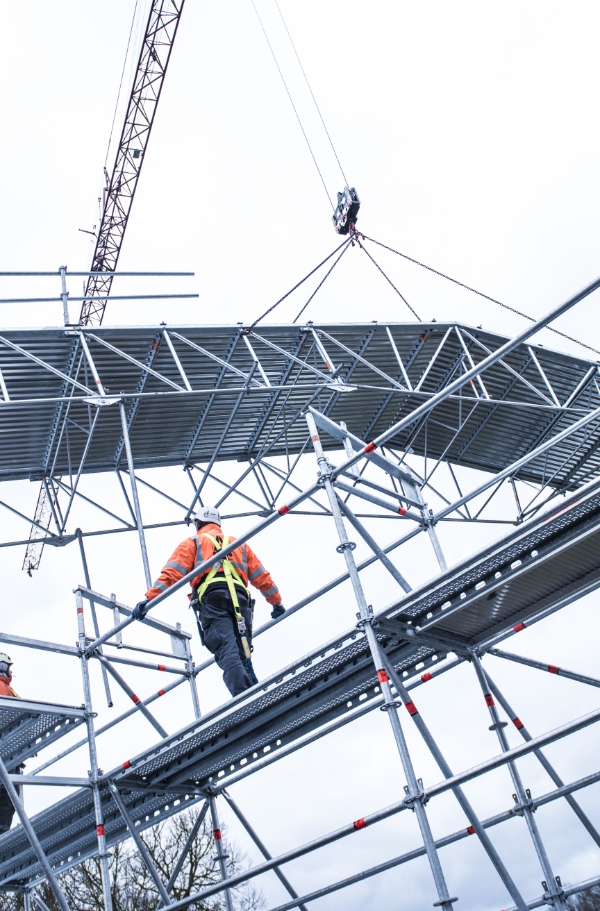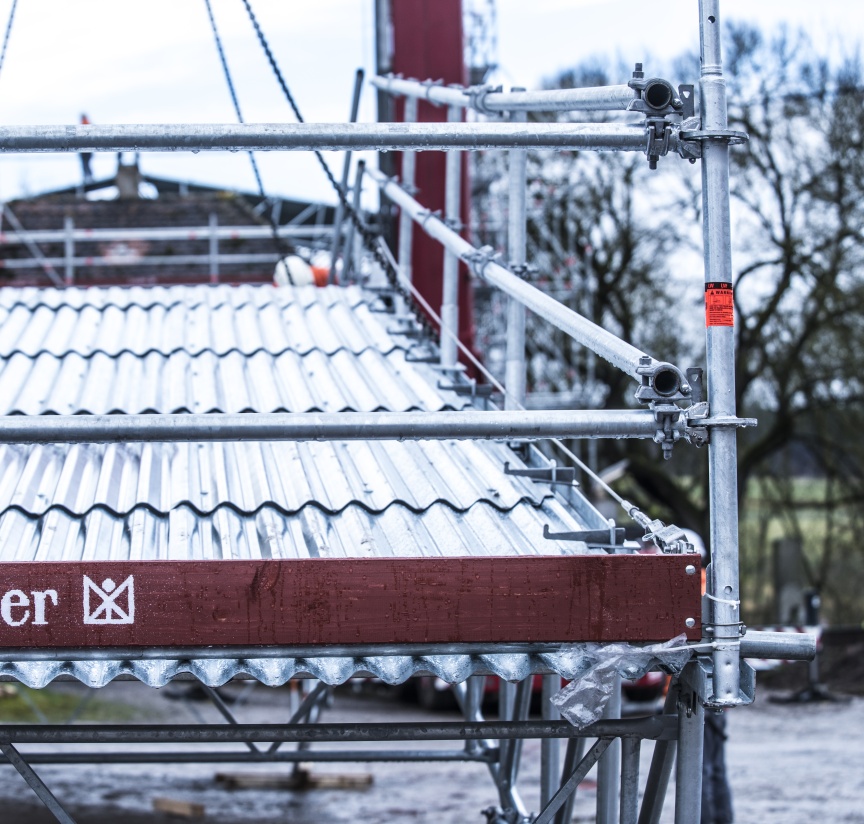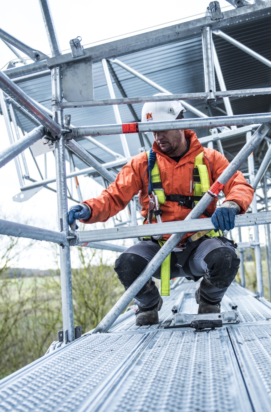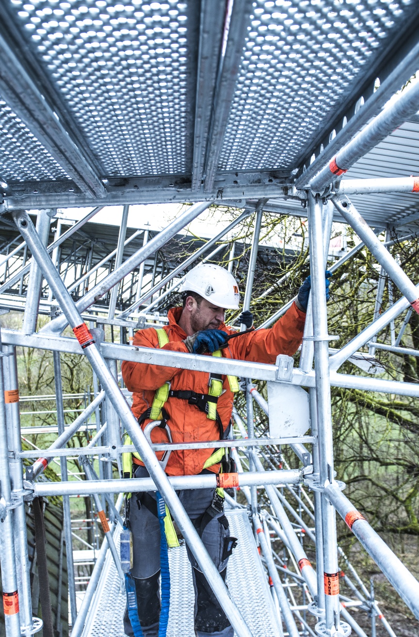 The Layher Cassette Roof consists of a truss substructure with corrugated iron cassettes on top, which are easily secured using wedges and clamping plates. Transparent cassette elements are also available to provide additional daylight to the construction site. The individual components are fitted with convenient handles that allow assembly by only two workers from a secured position. Individual cassette elements can be removed to allow for access, i.e. for bringing in building materials. The structure can be walked on and will withstand snow load. The Layher Cassette Roof solution can be mounted on both the Layher SpeedyScaf as well as the Allround System and not only offers protection for construction sites, but is also a quick and straight-forward solution for temporary hall constructions when combined with the Layher Protect System. “One of the major advantages of the systems offered by Layher is their great flexibility and range of available standard components, which allowed us to complete most of our projects without any expensive or time-consuming custom solutions”, Dittus explains from the perspective of an experienced scaffolding expert.