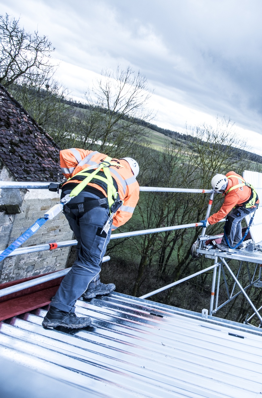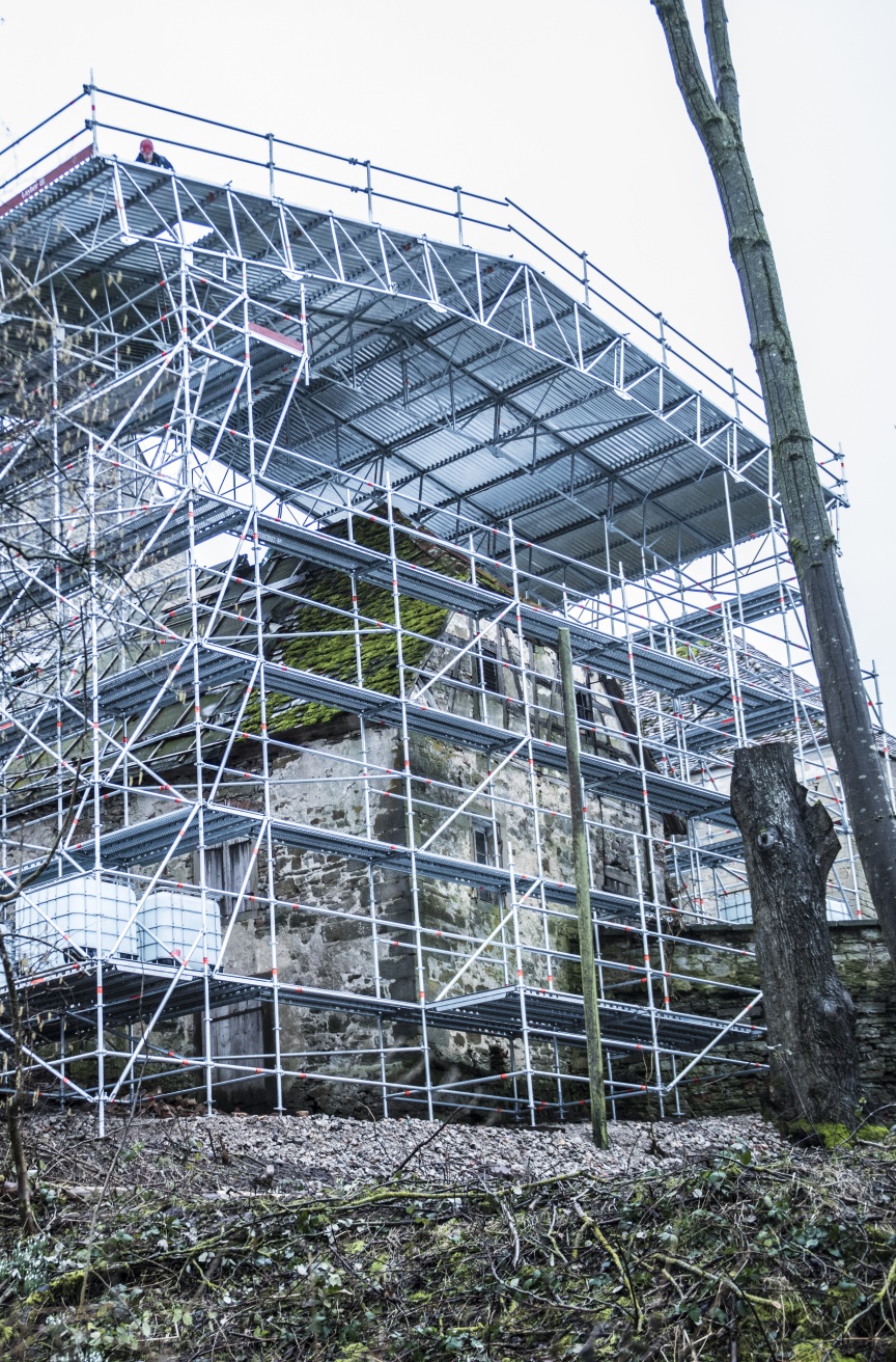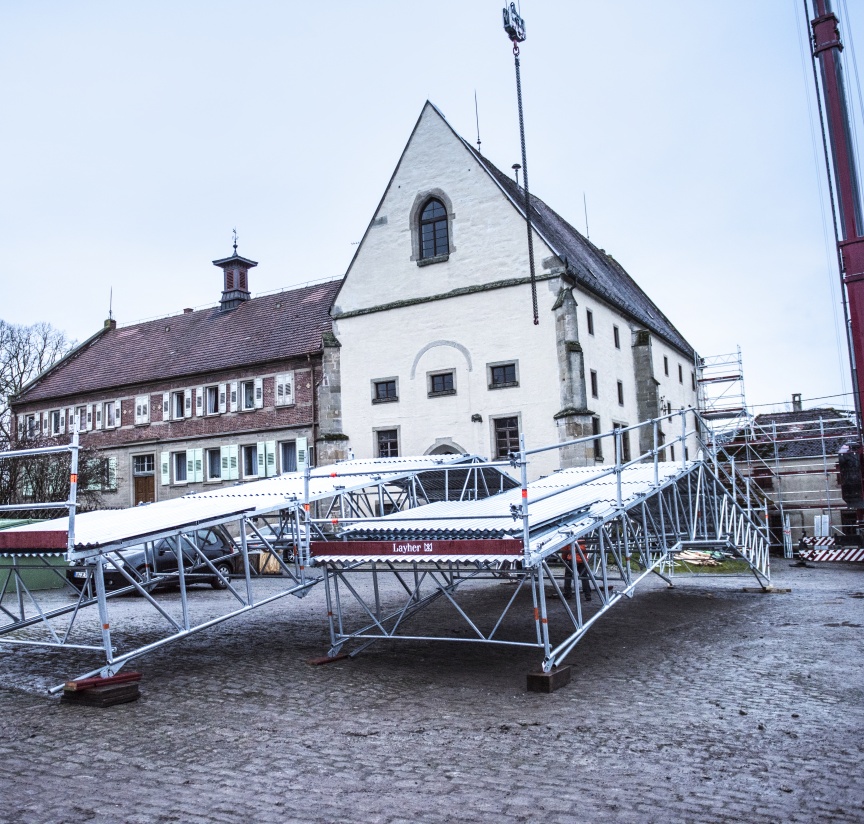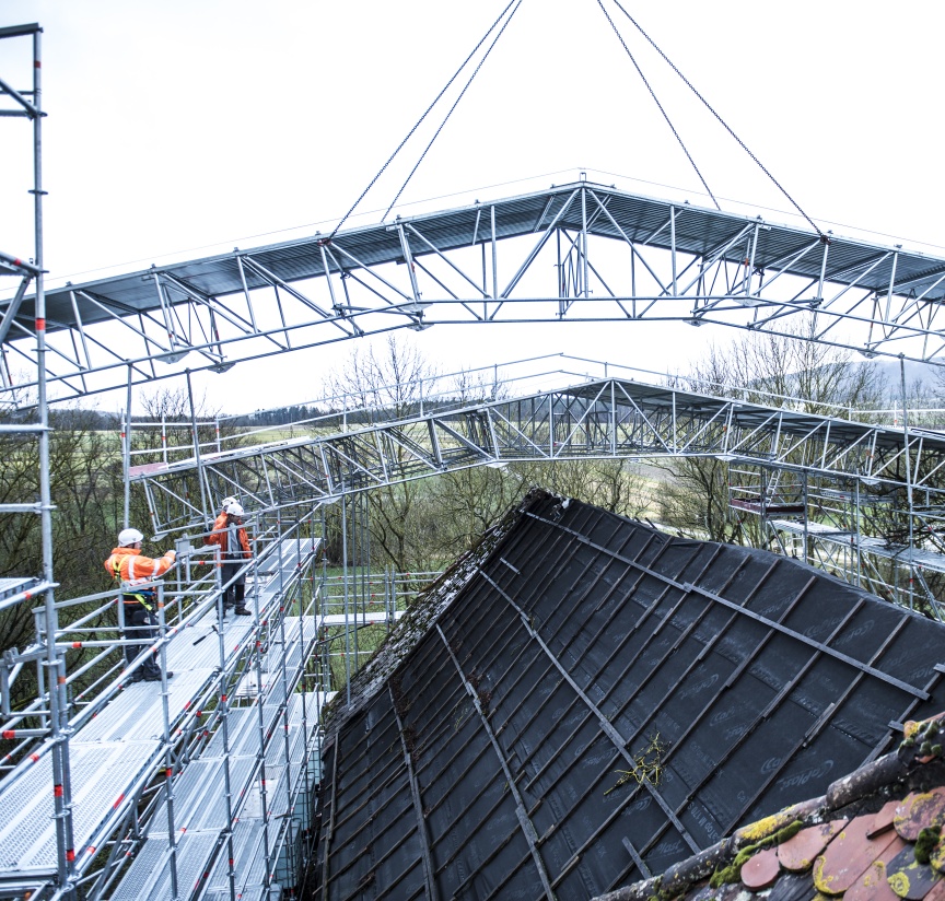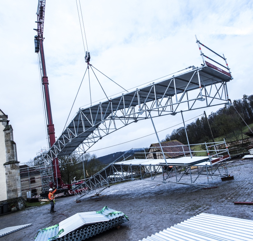 Dittus commissioned a team of five workers to erect an Allround Scaffolding around the former monastery chapel that is structurally connected to the blacksmith building. The entire planning of the scaffolding and roof for this special project was prepared by the Layher Technical Department. The fact that the walls of chapel and blacksmith buildings were interlocking called for a solution that would allow the protective roof structure to rest on one side of the Cassette Roof without additional support. This requirement was solved by an additional transverse-mounted lattice girder to provide dedicated support for the roof truss. Additionally, the cantilever scaffolding was secured against wind impact by a wider footing and additional ballast. The six truss bays with a weight of 1.6 tons and a width of 17 metres each, which had safely been pre-assembled on the ground, were fitted at height using a mobile 60-ton folding crane, which allowed the scaffolding workers to mount the parts quickly and precisely on the prepared Allround substructure. It didn’t take long for the Layher material to once again prove its outstanding flexibility when the specialists were tasked to build around a protected tree that could not be pruned. Temperatures around freezing point with intermittent soft hail were an additional challenge to the occupational safety of the workers on the roof fields. They used a safety rope, which ran across the whole length of the trusses and allowed them to work safely and without their movements being obstructed by annoying safety equipment attached to them.