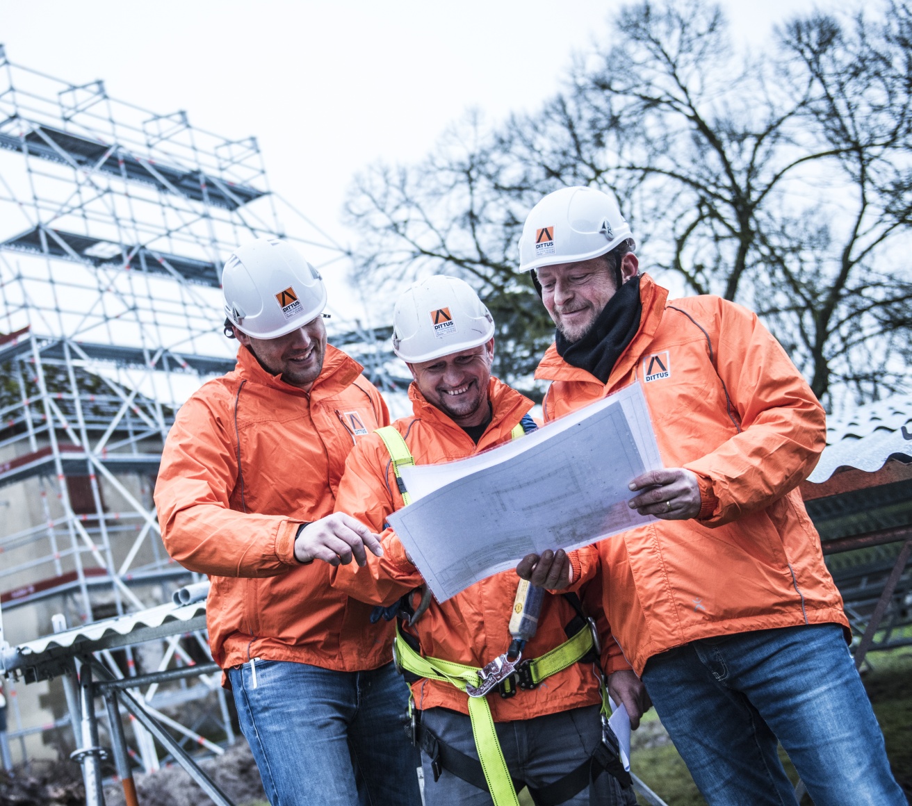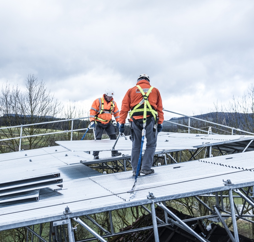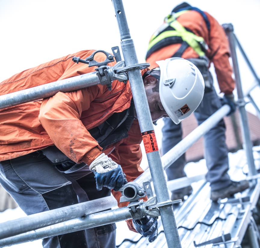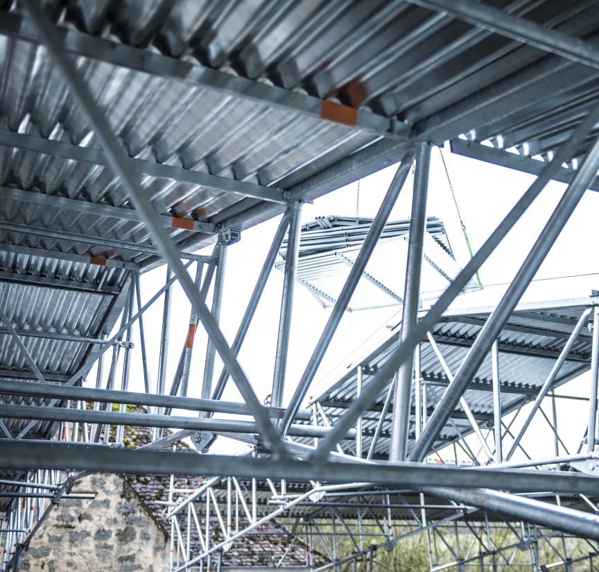 Dittus commissioned a team of five workers to erect an Allround Scaffolding around the former monastery chapel that is structurally connected to the blacksmith building. The entire planning of the scaffolding and roof for this special project was prepared by the Layher Technical Department. The fact that the walls of chapel and blacksmith buildings were interlocking called for a solution that would allow the protective roof structure to rest on one side of the Cassette Roof without additional support. This requirement was solved by an additional transverse-mounted lattice girder to provide dedicated support for the roof truss. Additionally, the cantilever scaffolding was secured against wind impact by a wider footing and additional ballast. The six truss bays with a weight of 1.6 tons and a width of 17 metres each, which had safely been pre-assembled on the ground, were fitted at height using a mobile 60-ton folding crane, which allowed the scaffolding workers to mount the parts quickly and precisely on the prepared Allround substructure. It didn’t take long for the Layher material to once again prove its outstanding flexibility when the specialists were tasked to build around a protected tree that could not be pruned. Temperatures around freezing point with intermittent soft hail were an additional challenge to the occupational safety of the workers on the roof fields. They used a safety rope, which ran across the whole length of the trusses and allowed them to work safely and without their movements being obstructed by annoying safety equipment attached to them.