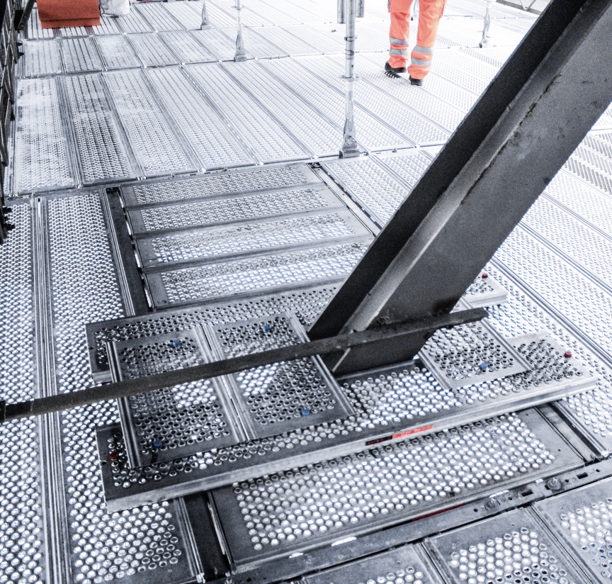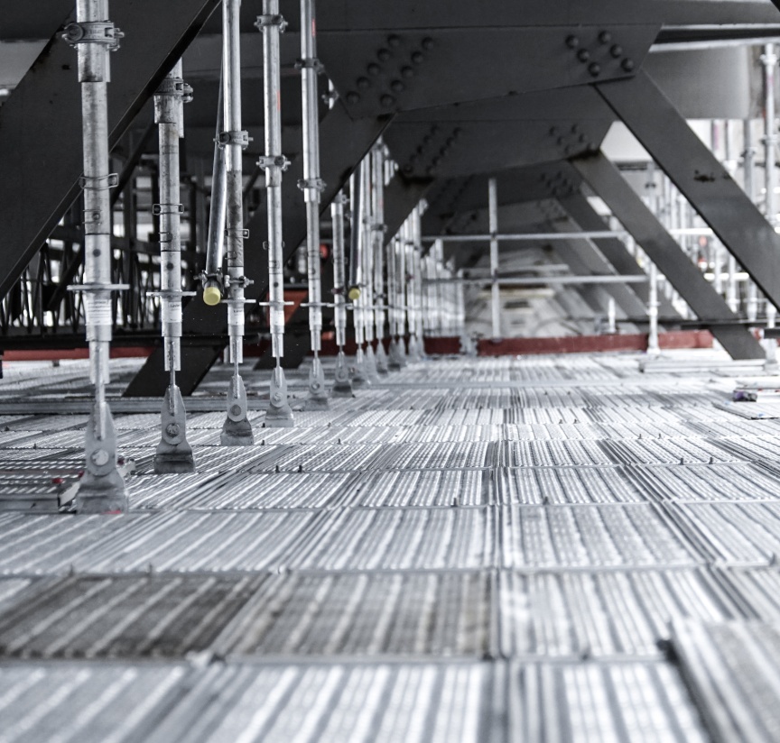 The work platform made it a simple task to dismantle the bridge being maintained and refurbish it next to the bridge itself. The amply dimensioned Layher Scaffolding System includes 4.5 m intervals that were greatly appreciated by the contractor’s personnel handling parts up to 9 m long, because it meant they could carry out their work underneath the bridge without any major obstructions. The basic structure comprised of Layher Allround components was suspended from the bridge’s own steelwork with the aid of couplers, with the individual standards linked in groups of three using wedge-head couplers. Layher steel decking in different lengths was located on the aluminium FlexBeams connected to these standards to form a reliable and sturdy work platform. By using decking in different lengths, the scaffolding could be adapted very flexibly to the situation on site.