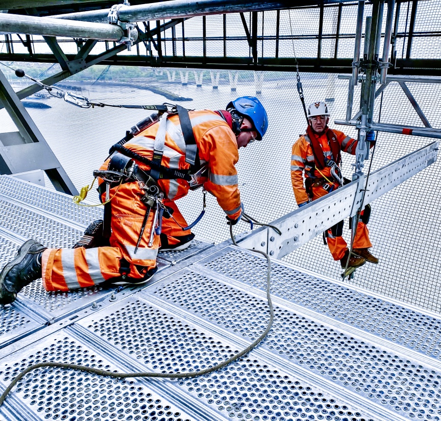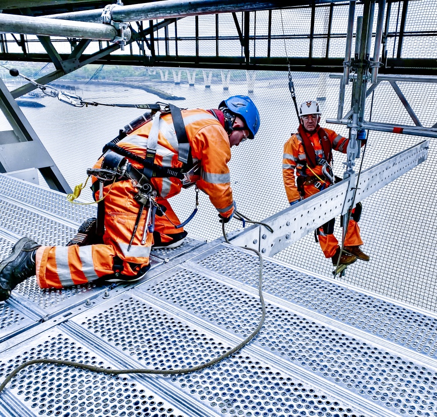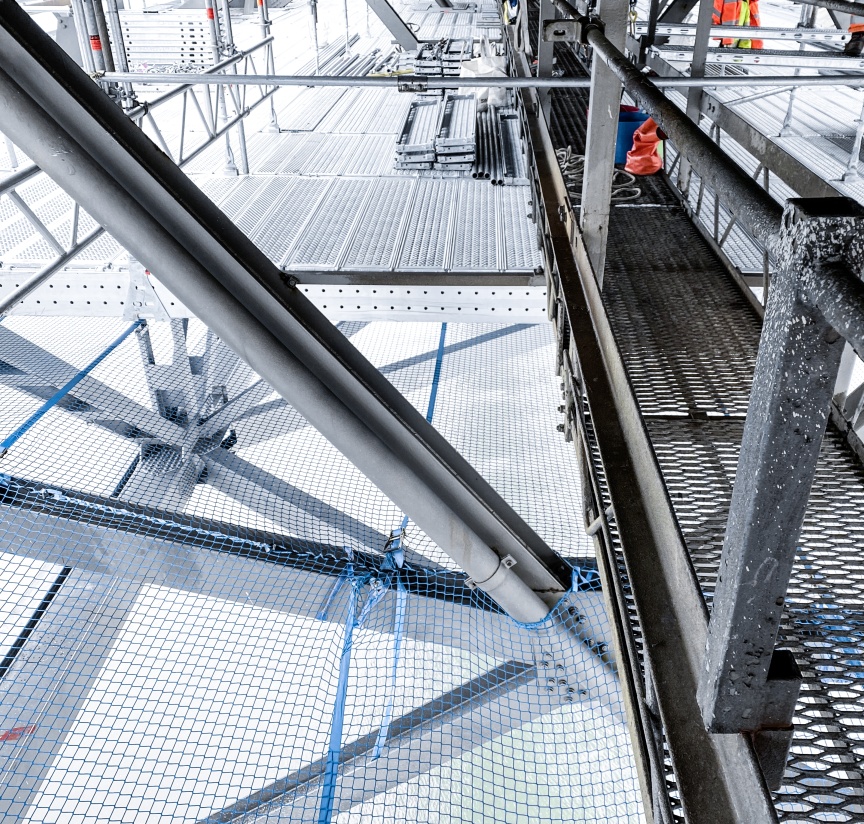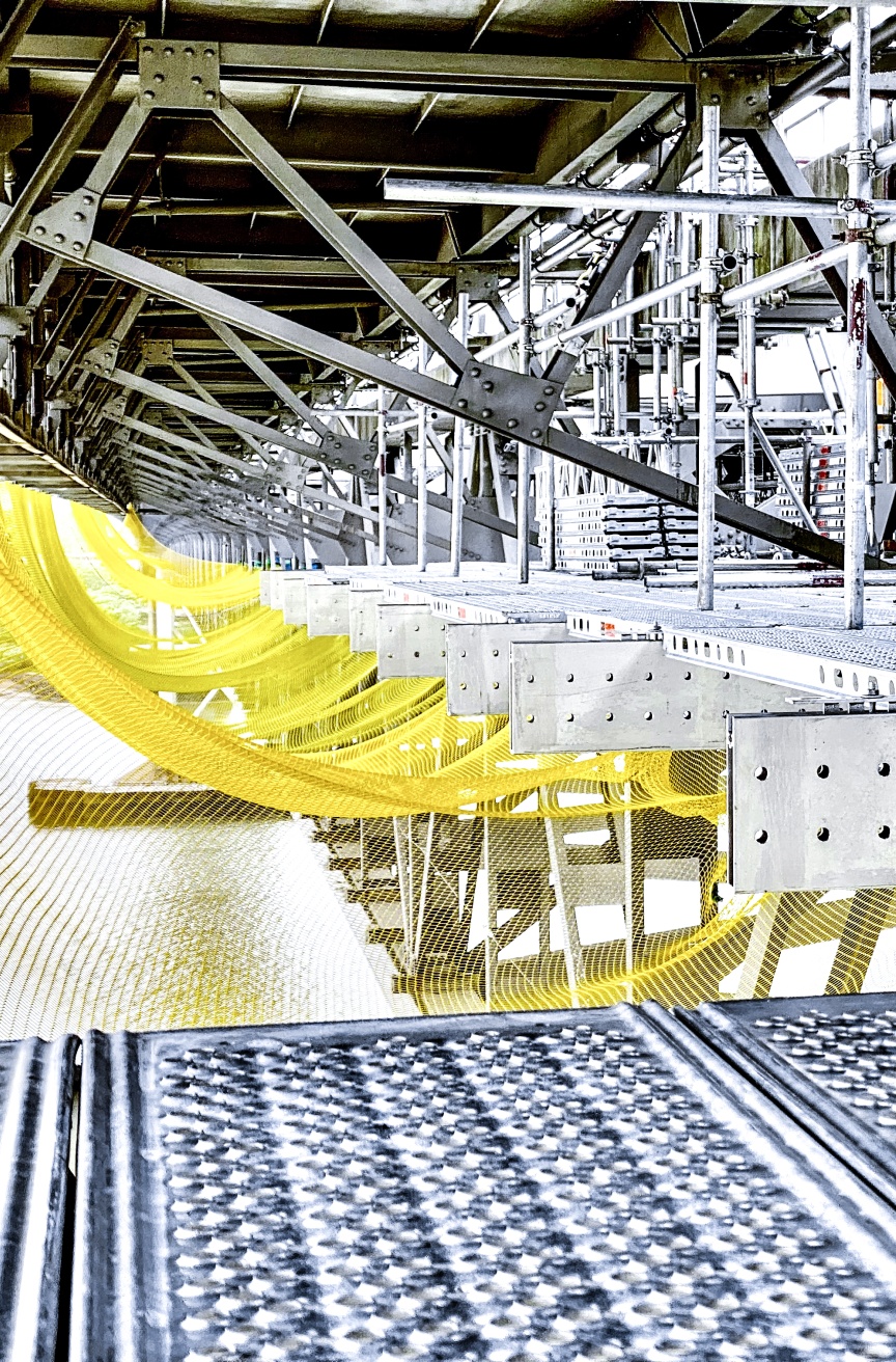 The project design was directly undertaken by Kenneth Redman, Technical Manager at the Layher depot in Livingston, Scotland, using Layher’s LayPLAN CAD planning software in 3D. “By using LayPLAN CAD, a detailed 3D design offering virtual walk-on access was available to the client in VR format before the assembly work began. This presentation was further persuasive evidence that suspending the work platform from the bridge’s own steelwork is extremely beneficial”, commented Sean Pike, Layher UK’s Managing Director. What’s more, the detailed design allows potential sticking points to be identified early on and suitable solutions found. Additional guardrail and edge protector elements were fitted where required for work safety reasons. Finally, safety netting was installed under the full working area to prevent dropped objects from falling into the waterway below.