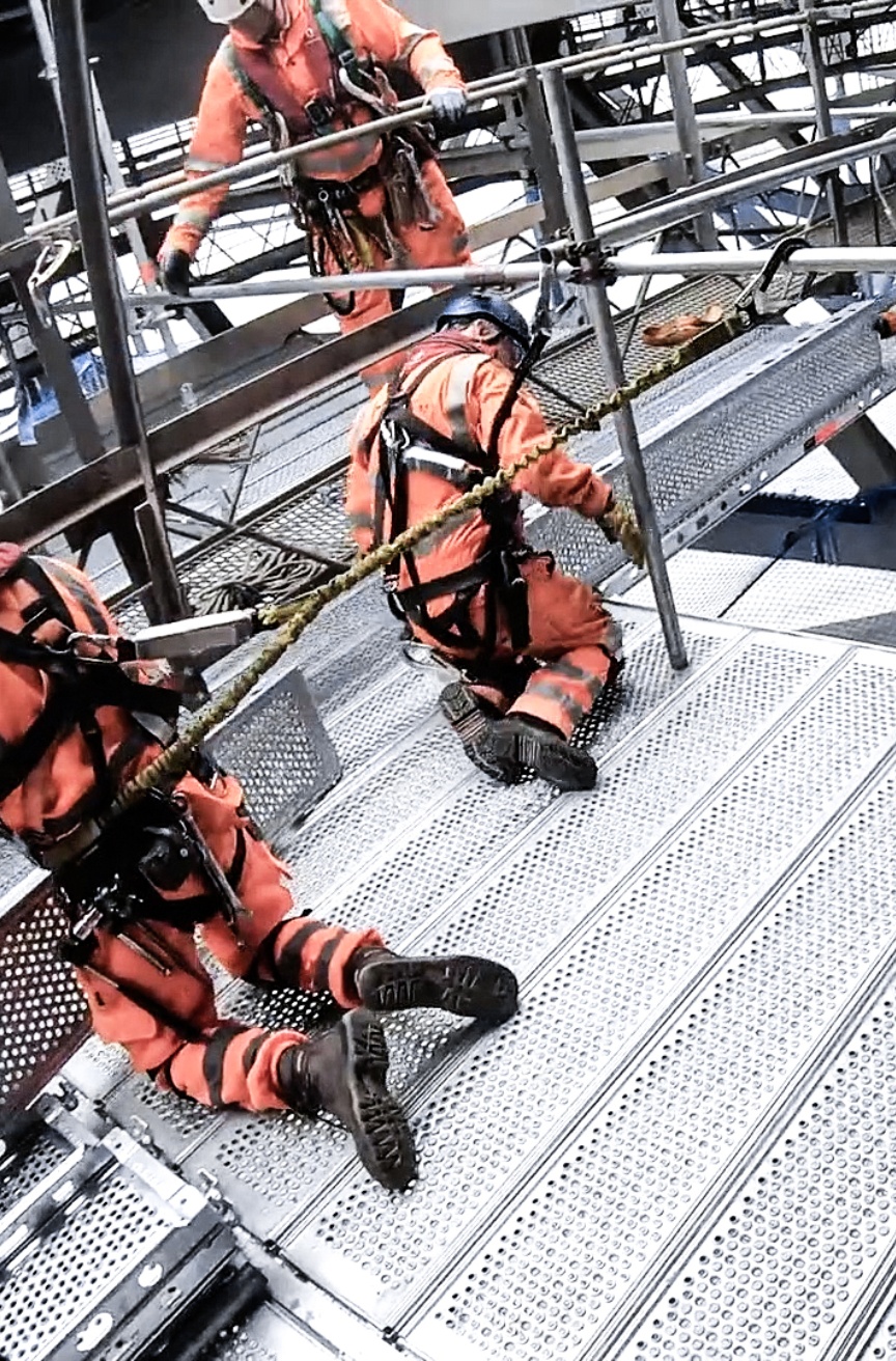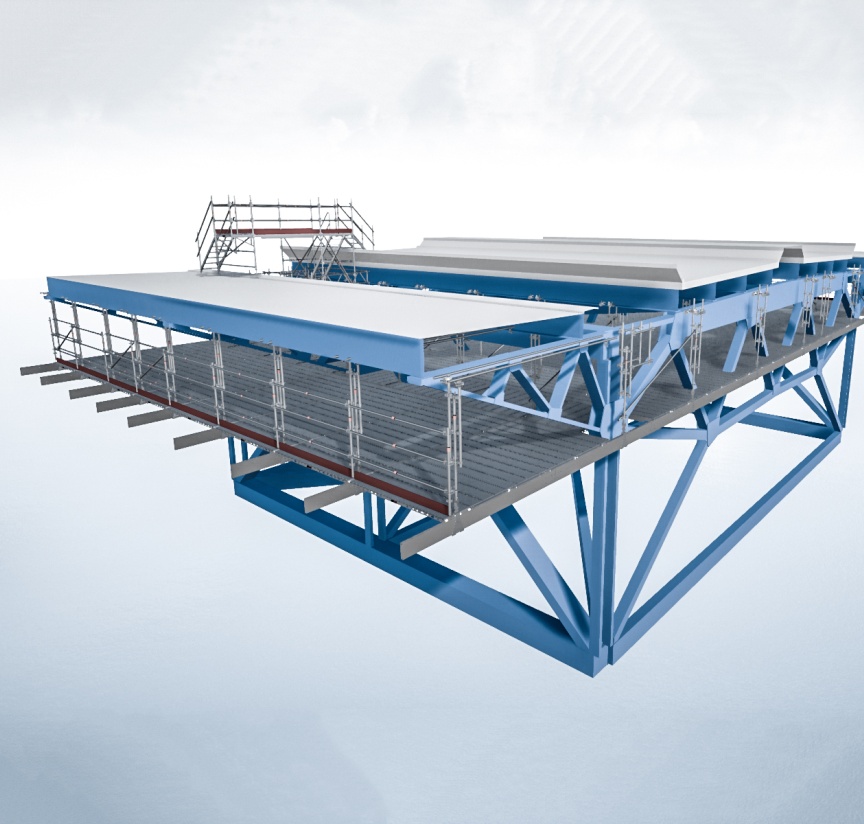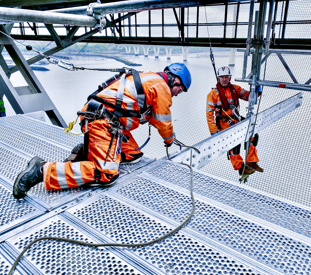 The project design was directly undertaken by Kenneth Redman, Technical Manager at the Layher depot in Livingston, Scotland, using Layher’s LayPLAN CAD planning software in 3D. “By using LayPLAN CAD, a detailed 3D design offering virtual walk-on access was available to the client in VR format before the assembly work began. This presentation was further persuasive evidence that suspending the work platform from the bridge’s own steelwork is extremely beneficial”, commented Sean Pike, Layher UK’s Managing Director. What’s more, the detailed design allows potential sticking points to be identified early on and suitable solutions found. Additional guardrail and edge protector elements were fitted where required for work safety reasons. Finally, safety netting was installed under the full working area to prevent dropped objects from falling into the waterway below.