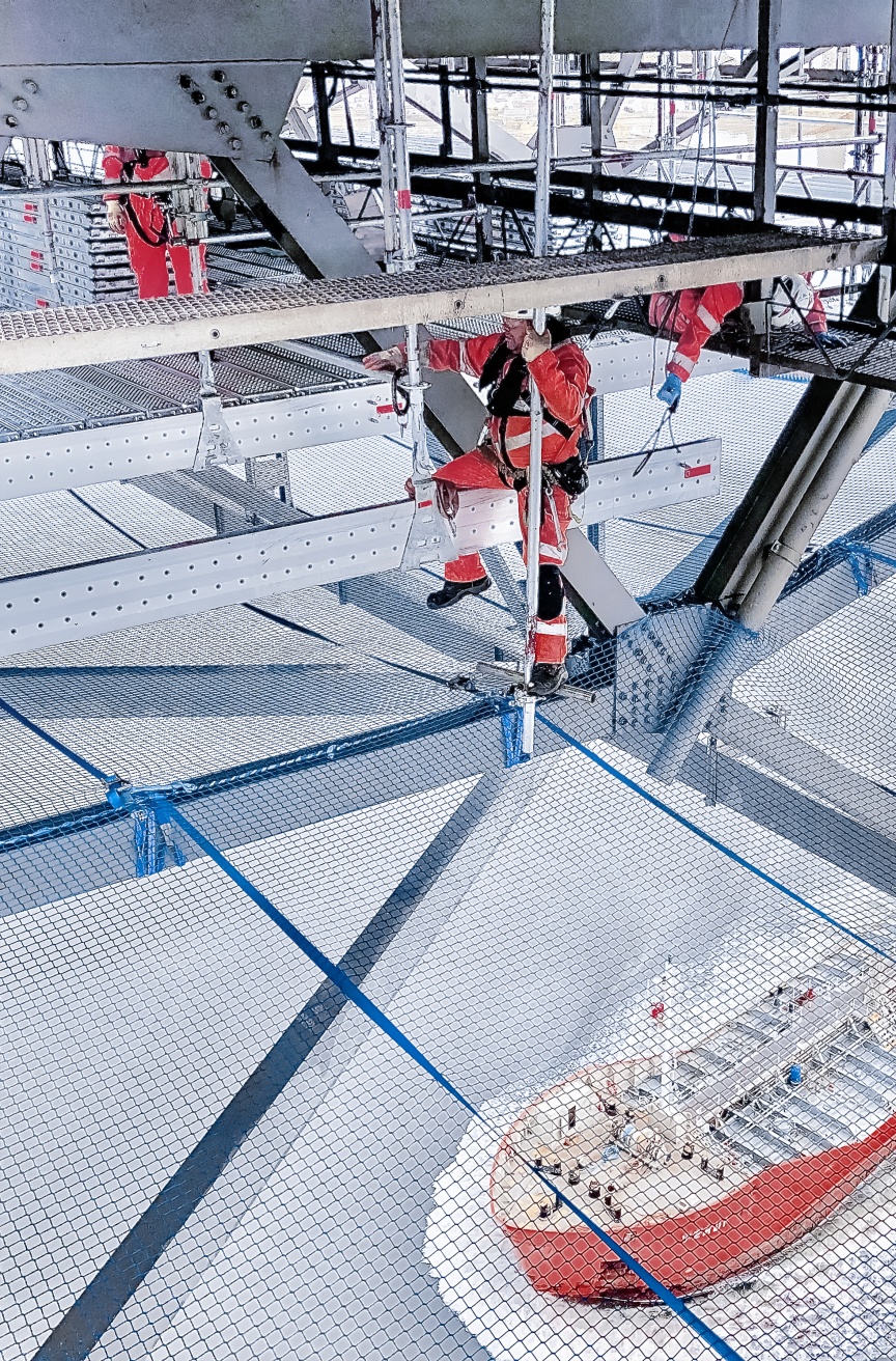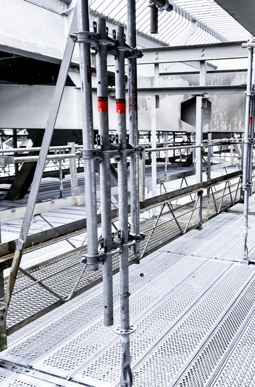 Ever since the eighties, a series of maintenance bridges totalling some 10 km in length has existed underneath the road deck, enabling easy and safer access to the bridge itself for ongoing maintenance and inspection activities. Another temporary access level now had to be created, so that these maintenance facilities could undergo their own programme of maintenance. Conventional tube and coupler scaffolding of the kind that is still commonplace in the UK was used for the first five phases due to it’s flexibility. However, we were able to convince the specialists at I-Scaff Access Solutions Ltd., the British firm responsible for installing it, of the Layher Allround System’s manifold benefits in combination with the aluminium FlexBeam for the sixth phase.