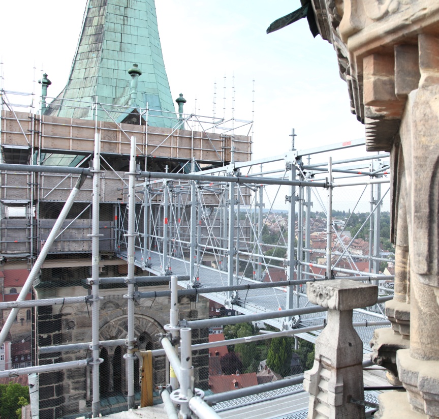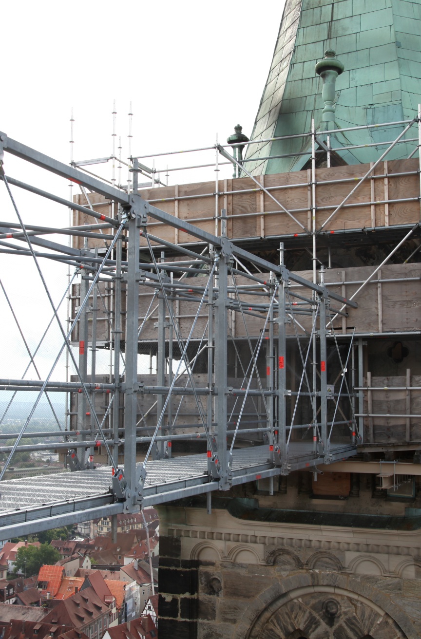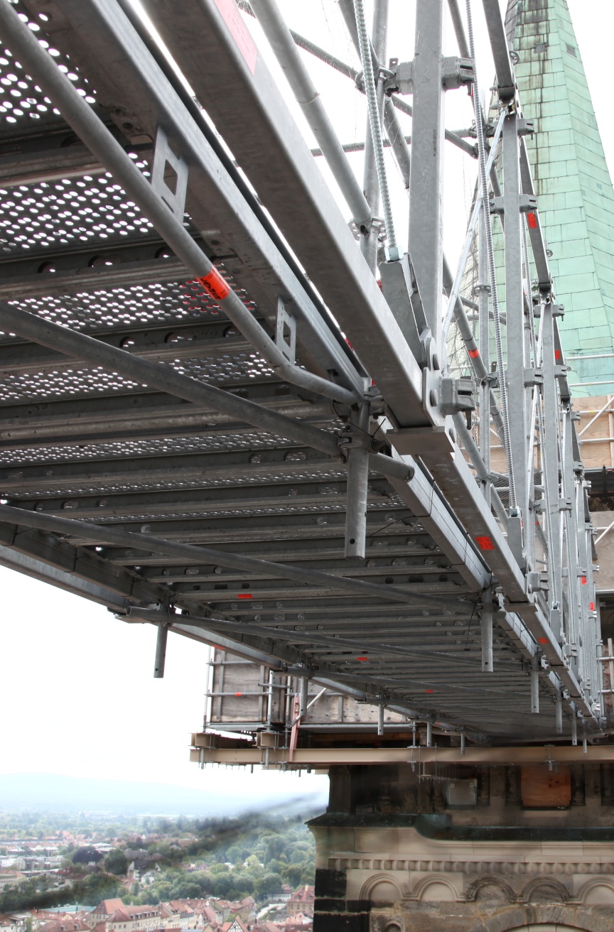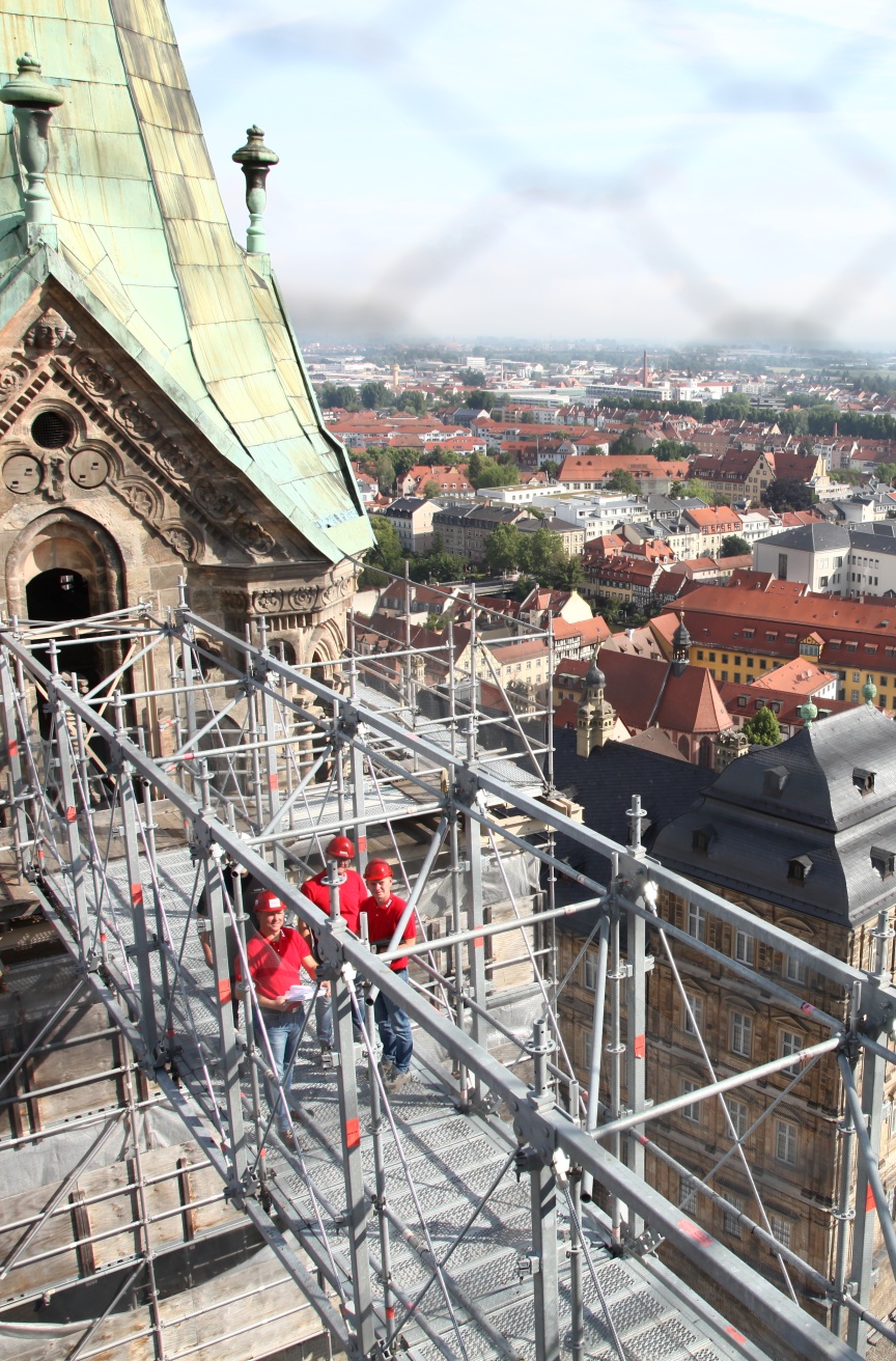 “We specialise in scaffolding solutions for listed building monument protection, as well as historical building and church renovations – to some extent because Bamberg has such exceptional historic architecture,” explained Udo and Thorsten Karl, Managing Directors of the company that is headquartered just outside Bamberg’s city gates. Karl Gerüstbau uses Layher Allround Scaffolding material because of its versatility, and is often the first company to try out the scaffolding manufacturer’s innovations. When new products are being used for the first time the Layher engineers and product managers are always on hand to provide advice and support in the planning and build phases. “We appreciate the personal service and the fast decision-making processes at Layher. In fact, we believe they are the reasons why our partnership is so successful,” emphasised Udo Karl in our interview. The Bambergers also pointed out the importance of the versatile Layher accessories that are integrated into the systems and have standard dimensions to maximise flexibility of use in the Allround Scaffolding structures. “The Layher Allround Scaffolding offers us endless possibilities. All the innovative products and accessories are practice-tested and noticeably improve the efficiency and reliability of our work. The accessories are also all dimensionally and statically perfect for the material we already have, including earlier generation products, which saves time during assembly and money,” added the scaffolding experts.