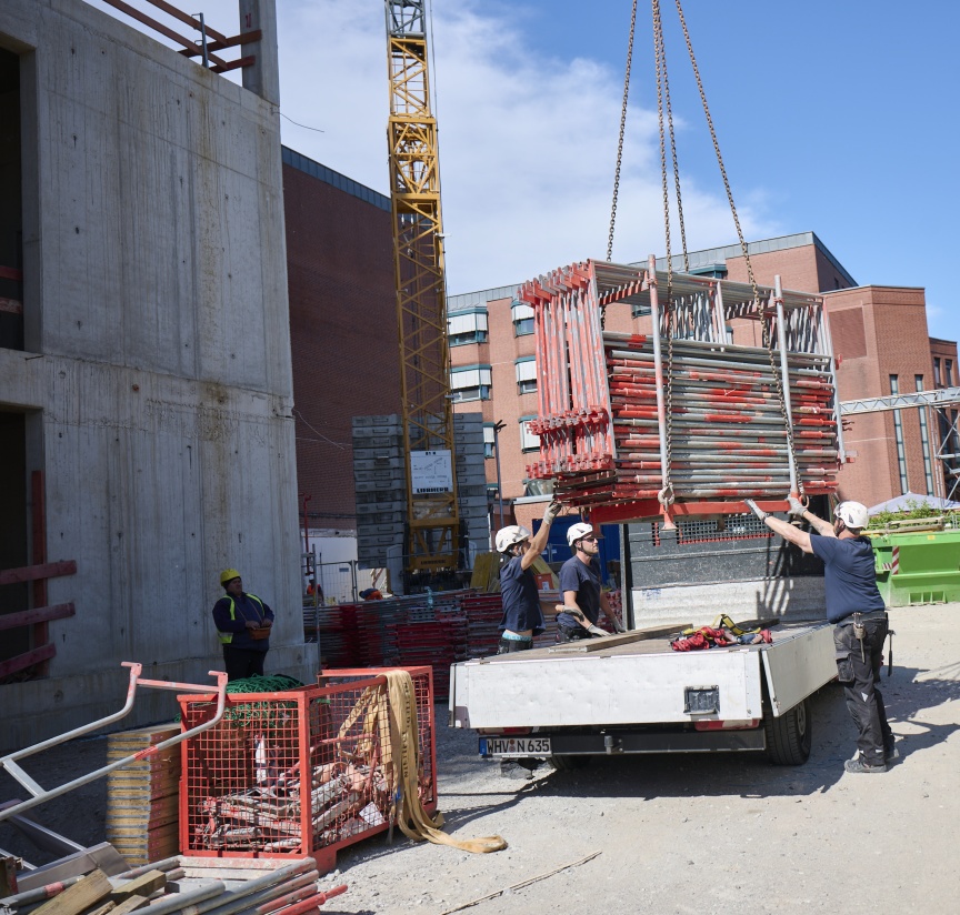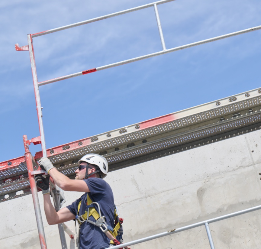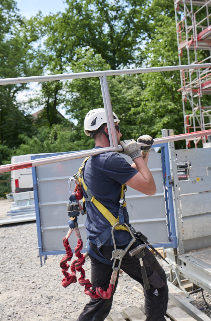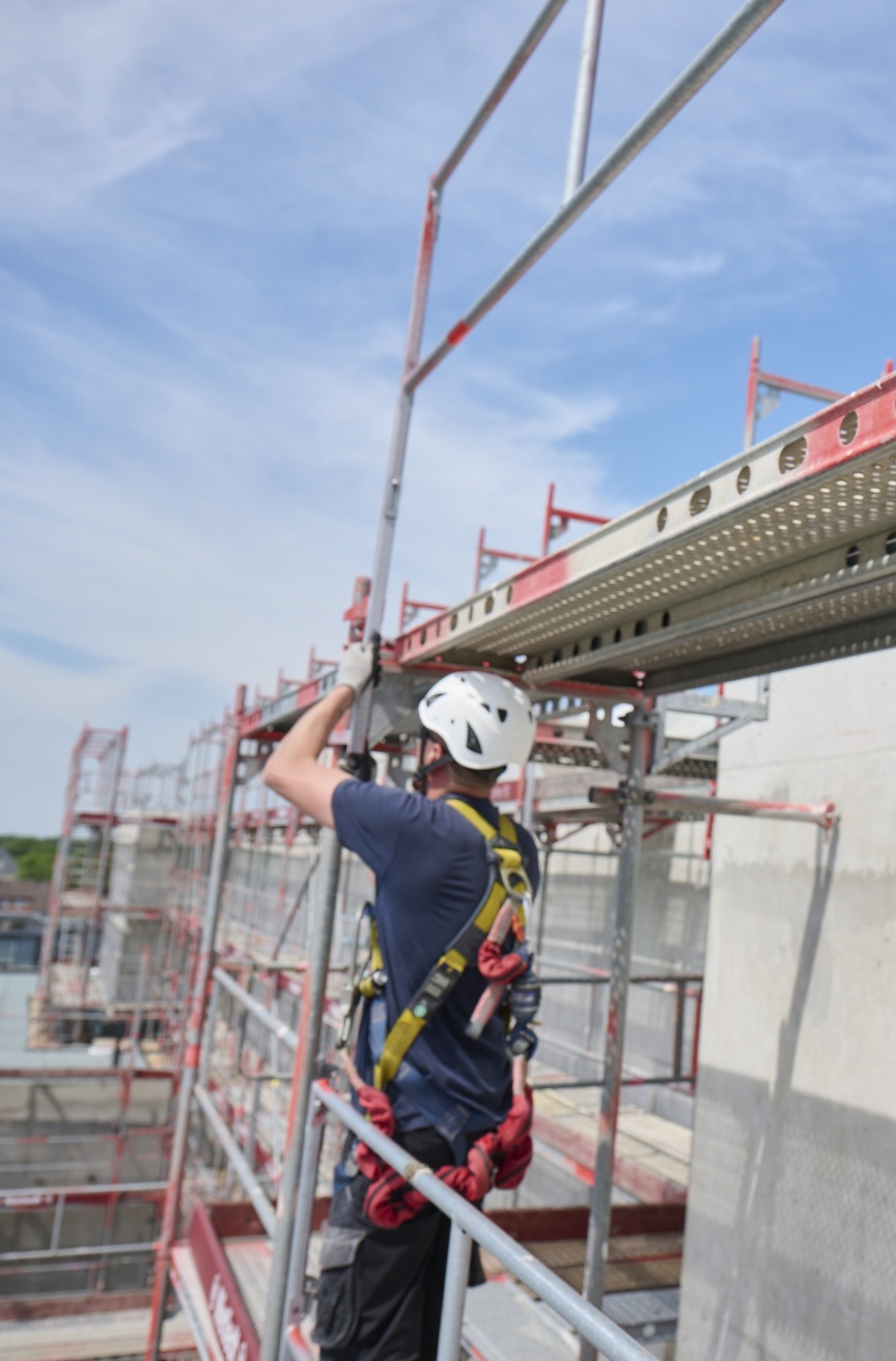 “With frame scaffolding, safer assembly was often difficult and only possible with additional PPE. However, the latest TRBS demands new solutions. We prioritise protective measures according to the TOP principle. It starts with helpful “T”echnical measures, which include the scaffolding materials used, such as the I-Guardrail. Step 2 is the corresponding “O”rganisational framework, which we have created with four of our own in-house, full-time safety specialists. Finally, there are the “P”ersonal measures, which we ensure above all by consistently wearing PPE on our construction sites”, says the scaffolding expert.