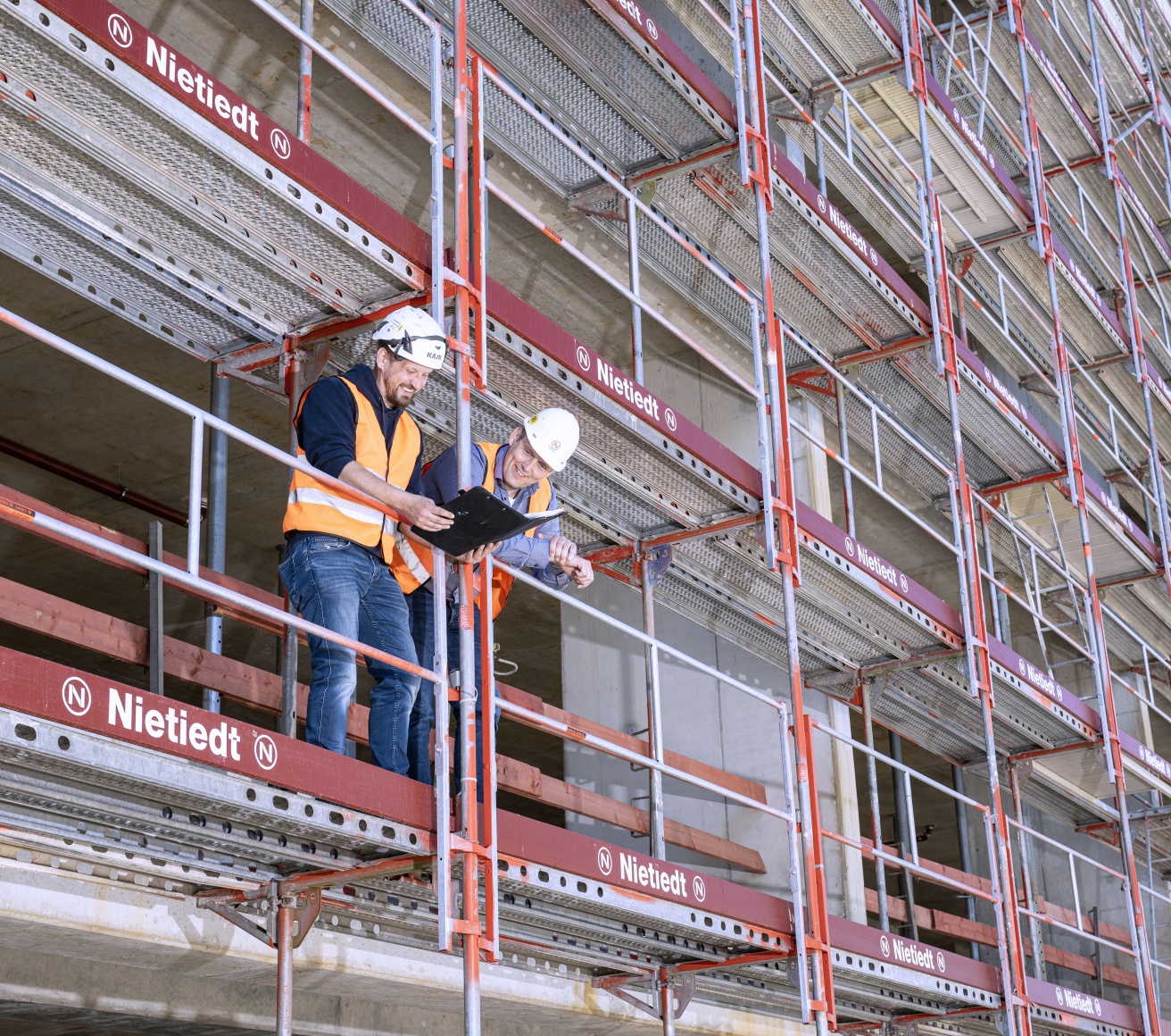 The Nietiedt Group has its beginnings in the 1930s and has grown since the war to an impressive workforce of 600 permanent employees. What began purely as a painting and decorating business has developed since the 1960s into a group comprising many different trades and 16 locations across Germany, covering a wide range of services in connection with construction and building protection. The scaffolding division is now the largest independent business unit, with headquarters on the impressive 3.6-hectare site at the oil terminal in Wilhelmshaven. It’s from here that Nietiedt’s scaffolders cover the entire country. Right from the start, the company has worked exclusively with scaffolding solutions from Layher. For three generations, the name Nietiedt has stood for quality and safety, and the company is one of the largest and most modern service providers in the scaffolding sector, with its technically sophisticated craftsmanship.