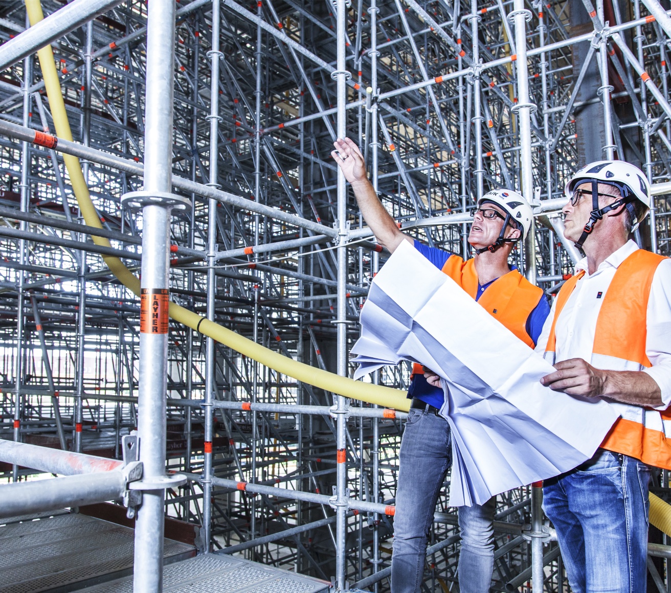 When you accompany Dieter Gescher, statics expert at Teupe & Söhne Gerüstbau GmbH, CTO of Teupe GmbH Stahl- und Maschinenbau and head of the technical office with 14 staff, through the breath-taking new Axel Springer building his enthusiasm for all the technical details of this construction project is infectious. It is designed so that the first four floors up to the atrium create the impression of a stairway, followed by a straight diagonal line back to the roof from the fifth floor upwards. In order to be able to dispense with as many supporting elements as possible, the top five floors will be hung in suspension with the help of a steel heavy-load structure, the so-called ‘transfer support structure’. During the construction phase individual loads of up to 5,200 kN are being supported by a combination of standard Allround Scaffolding components and Teupe heavy-duty towers. “Here in the atrium we’ve got a birdcage structure composed of 125,000 m3 of Layher Allround Scaffolding and 1,200 t Teupe heavy-duty towers to cope with these enormous loads,” said Ludger Schroer, Teupe’s Senior Site Supervisor. “Layher’s material and ‘more possibilities’ concept ideally equips us for our projects,” explained Dieter Gescher.