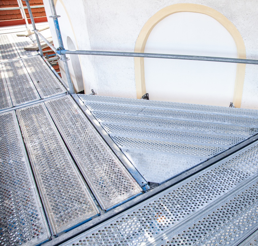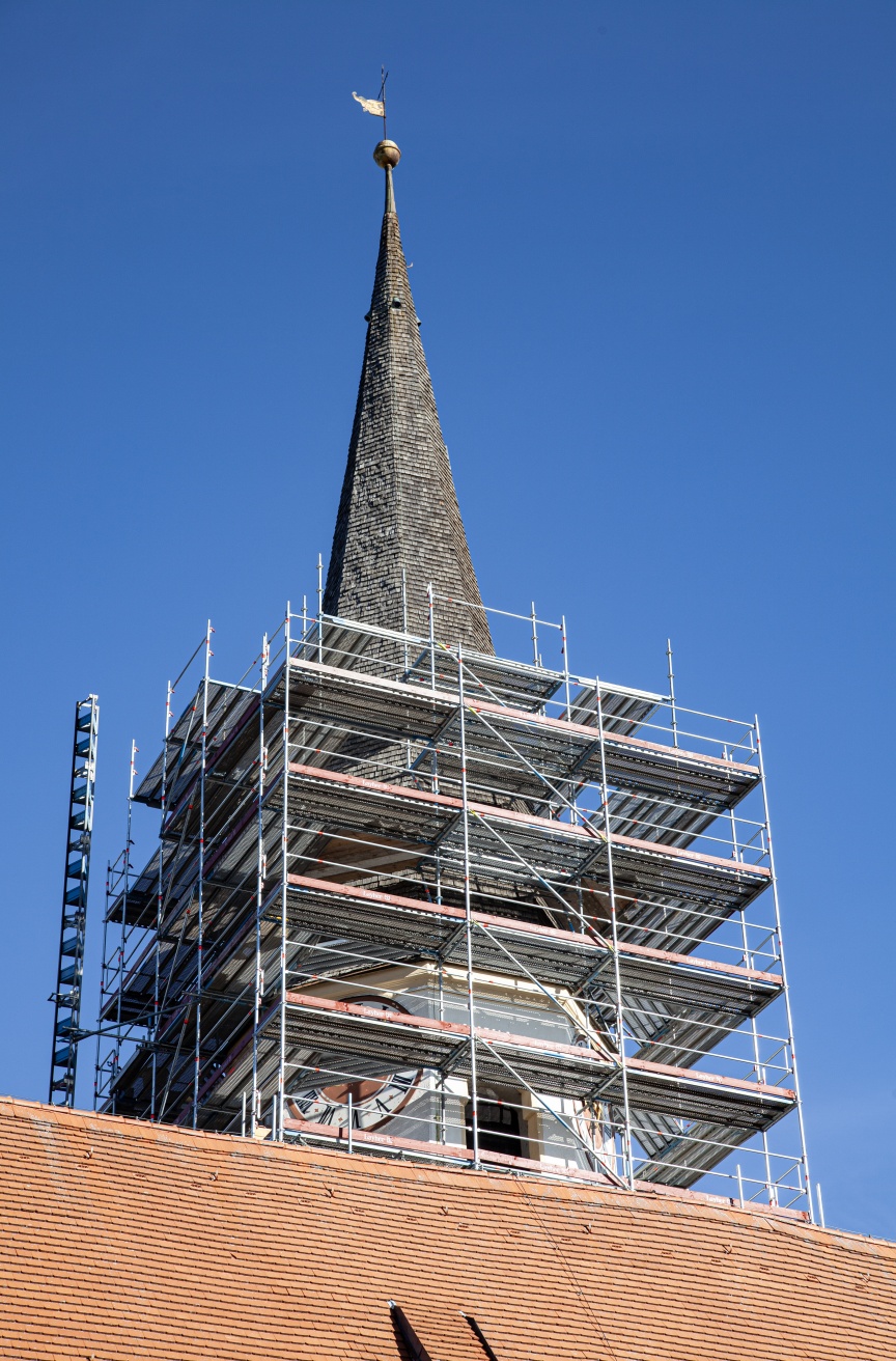 Planning in 3D is a good idea whenever the geometry of a building is complex and there are numerous interference contours that make it difficult to erect scaffolding. If no 3D-files of the Since the AGS System is fully integrated into Layher Allround Scaffolding, any system components can be used. In Otterfing, for example, the top section of the tower is octagonal in shape. The resulting corners were a very simple matter to close using U-steel decks 45°. In view of the tower’s unclear structural properties, the top section of the scaffolding also had to be shored with Allround brackets fastened to the 1.3 metre thick tower wall. The modular Allround System includes suitable inner brackets, which enable the scaffolding to be adapted to the spire’s geometry step by step all the way up to the tip, ready for refurbishing.