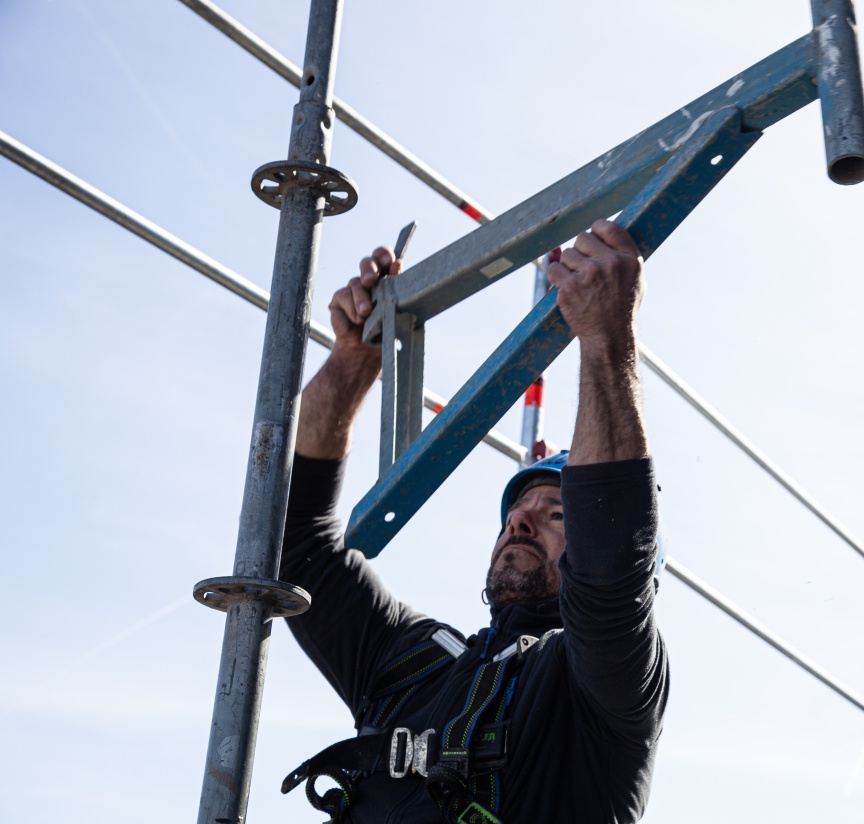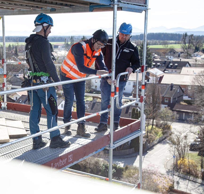 “To get straight to the point, the AGS System convinced us both in terms of handling and because it combines easily with our other Layher material – we’ll definitely be using it for more projects in the near future”, says Managing Director Franz Westermaier Junior in conversation with our Area Sales Manager, Ardian Gashi. In order to comply with current safety regulations, the Bavarian scaffolders opted for the modular access system for facades AGS made by Layher, whose AGS standard and AGS guardrail permit assembly from secured levels. An external platform stairtower and additional scaffolding construction hoist facilitate access and material transport.
