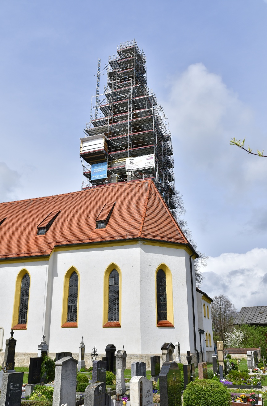 The small town of Otterfing is the northern gateway to the Bavarian district of Miesbach. With a population of 5,000, it is situated between Munich and the Alps, which seem close enough to touch when the weather is right. The Catholic church of St George, built in the late Gothic style around 1530, stands in the middle of the cemetery and with its 40 metre high bell tower is a prominent landmark that can be clearly seen from afar. Woodpeckers and exposure to the elements have taken their toll on the wood shingles over the years and the tower roof is now in need of general refurbishment. Specialists from Gerüstbau Westermaier GmbH of Bockhorn, a good 60 km away, have already taken on similar scaffolding challenges in recent years while working on other projects in the local region. Franz Westermaier Senior and Franz Westermaier Junior are the firm’s joint Managing Directors. The decision to use a 3D laser scan as the basis for planning and the first-ever deployment of around 40 tonnes of Layher’s modular access system for facades AGS were what made the Otterfing assignment unique.