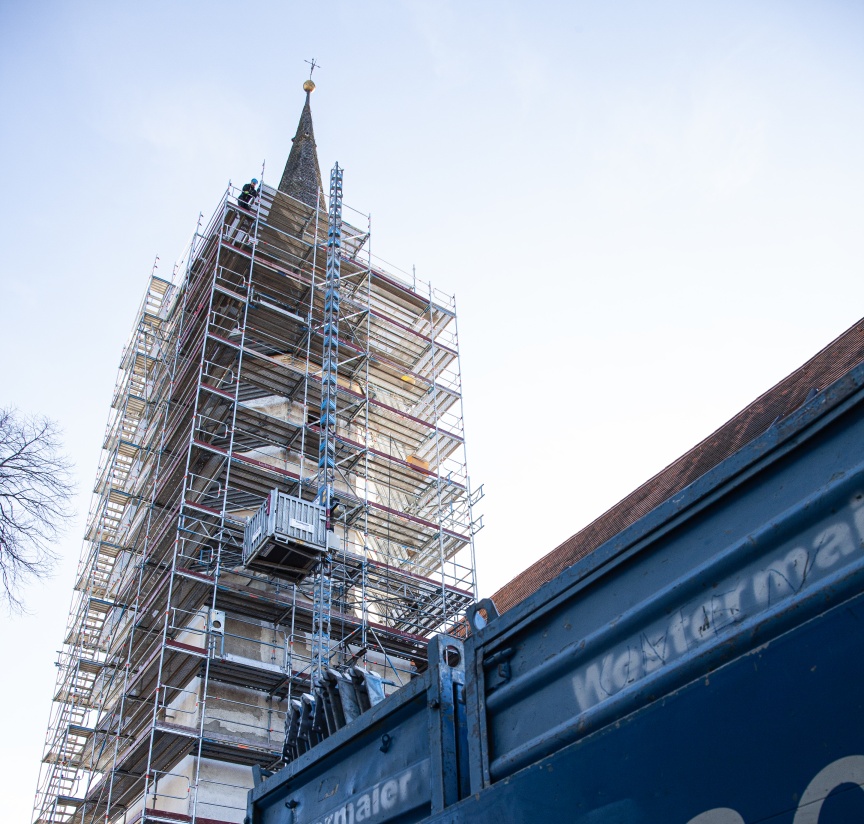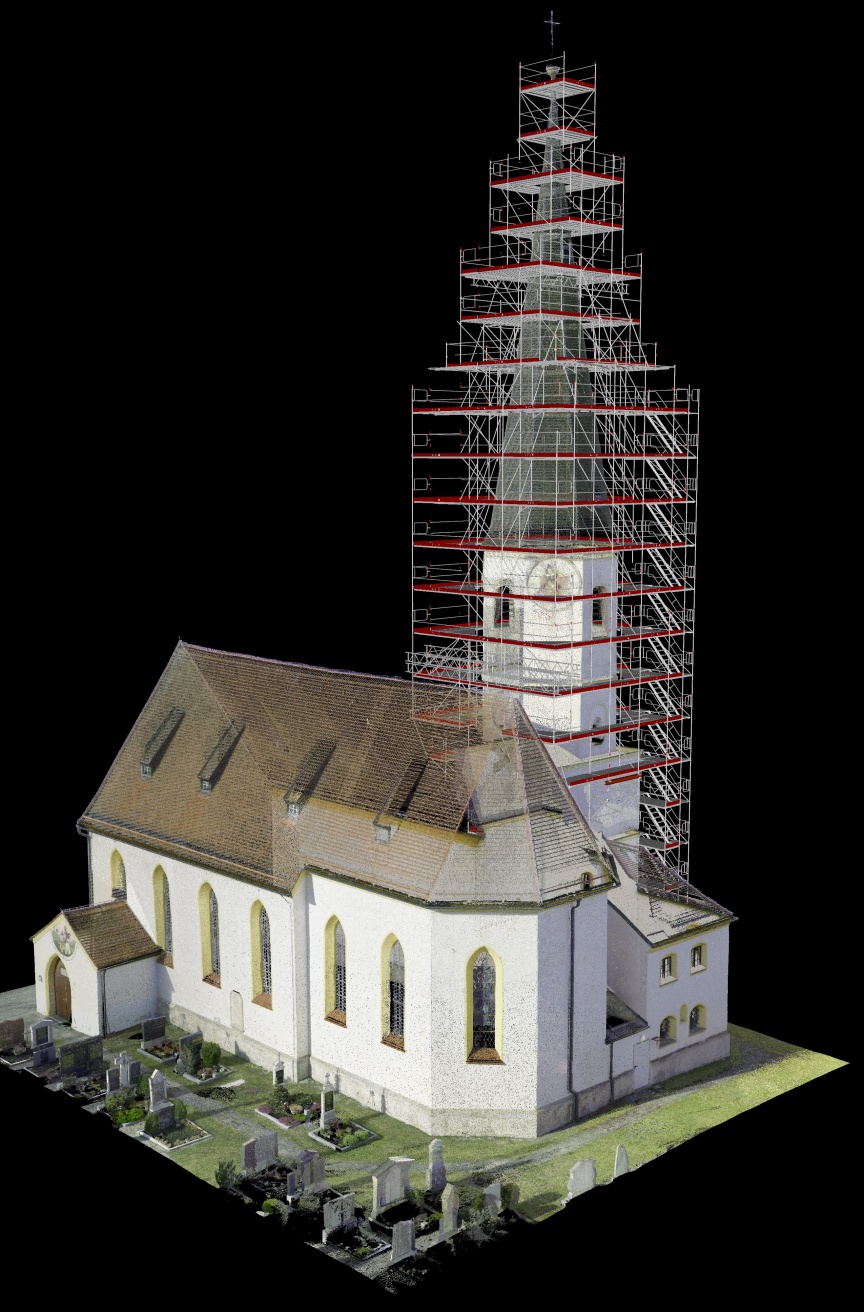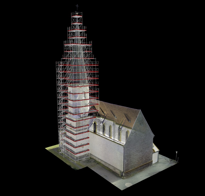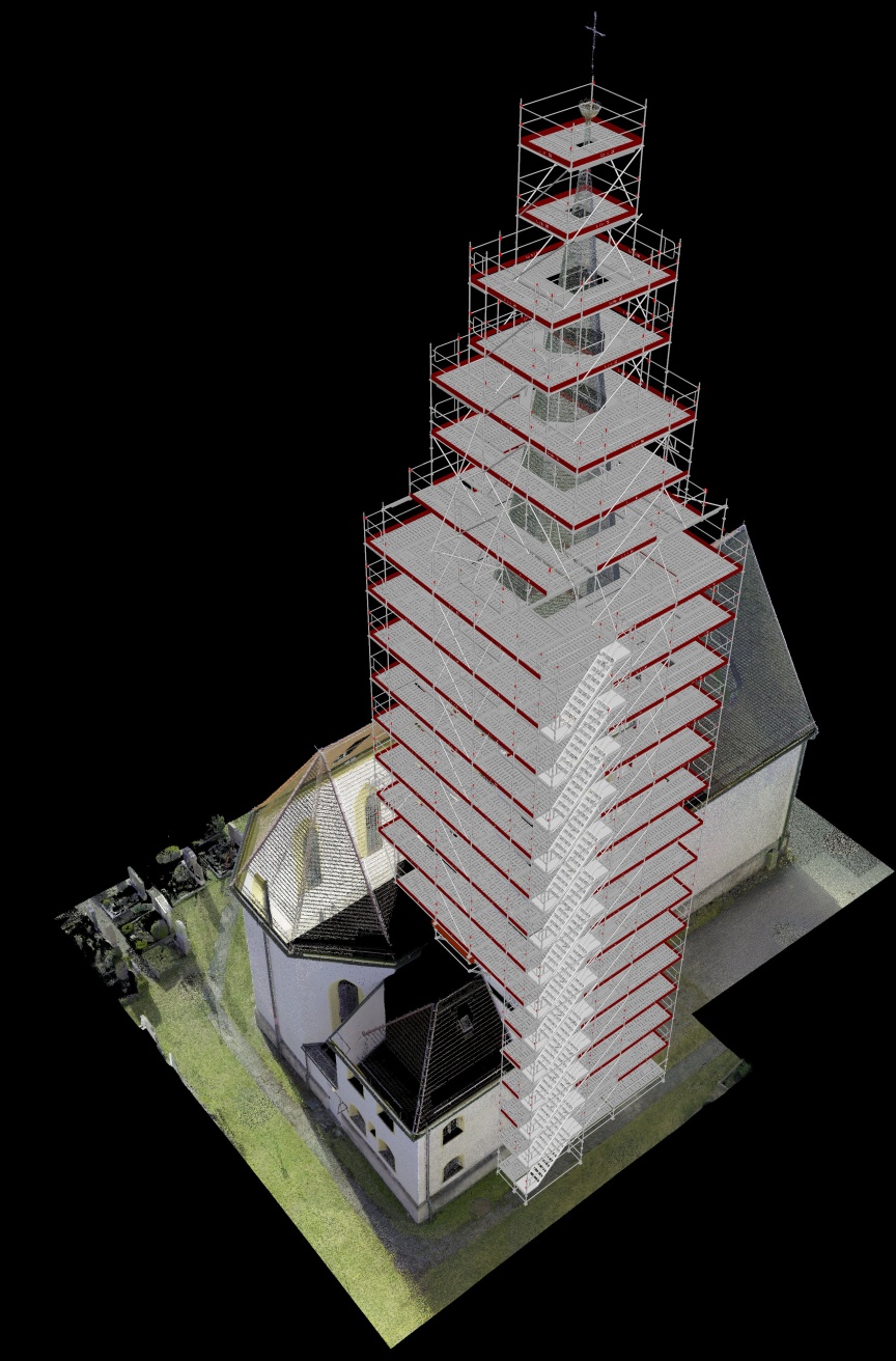 “As with many historic buildings, no reliable plans or structural analyses exist for the church in Otterfing”, the Managing Director explains. “That’s why we took Layher’s advice to have the church scanned by Layher 3D laser scanning experts from Eibensbach as a basis for planning.” That data was then used to generate a digital twin and plan the scaffolding for the tower in 3D in LayPLAN CAD, right down to the