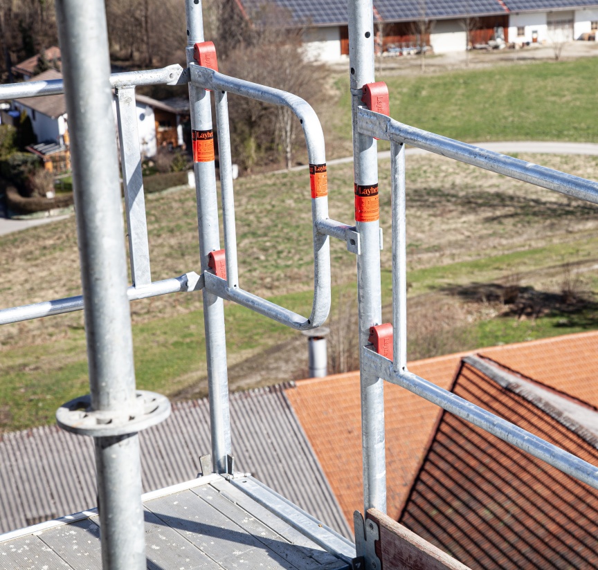 The red levers at the AGS guardrail connection enable the guardrail to be secured without tools during assembly. They remain closed during advancing fitting and removal from the secured level. Opening the bar allows the AGS guardrails in Otterfing to be removed quickly and easily once the scaffolding is complete – again, with no need for tools – for instance, in order to supply material to the construction site or dismantle the bell. If this is not desirable for safety reasons, the AGS guardrail Fixx can be utilised instead for a permanent guardrail solution. The matching AGS double end guardrail secures the open ends of the AGS System and can likewise be assembled quickly and easily from the secured level without additional couplers while advancing.