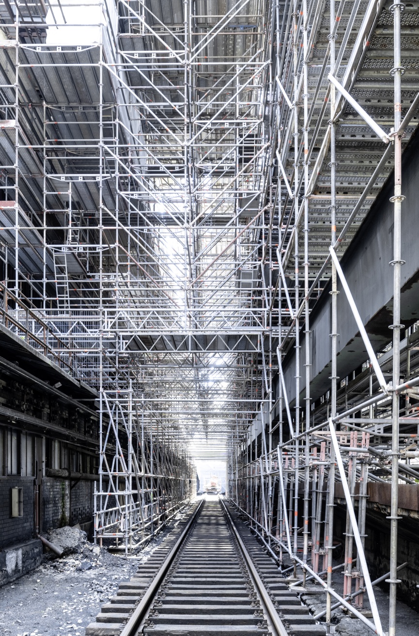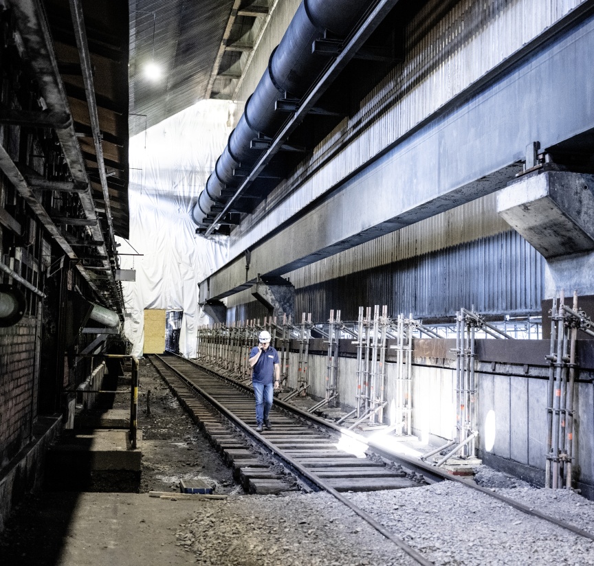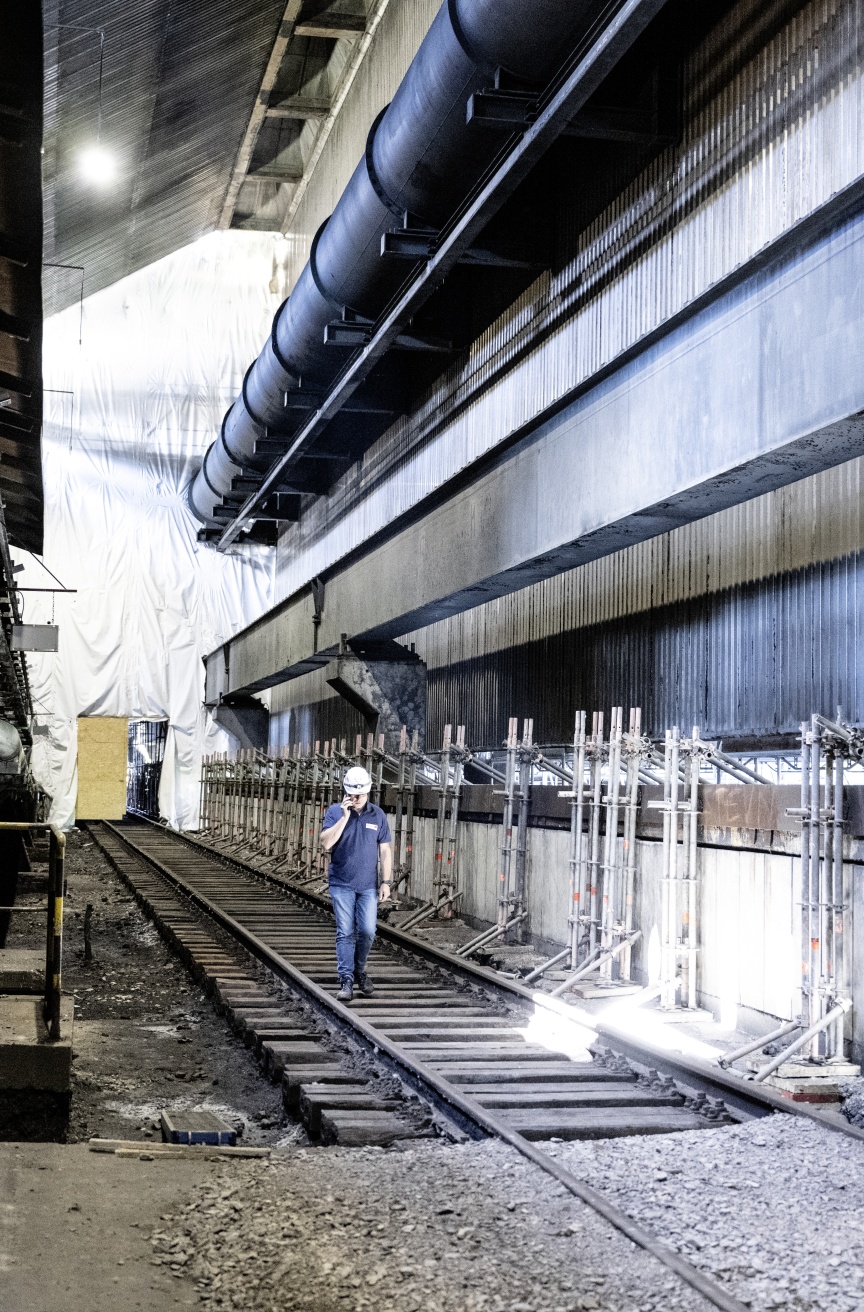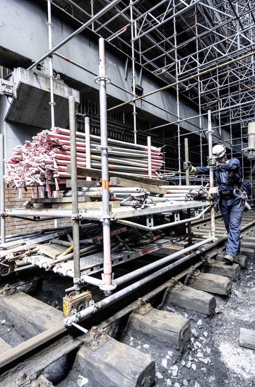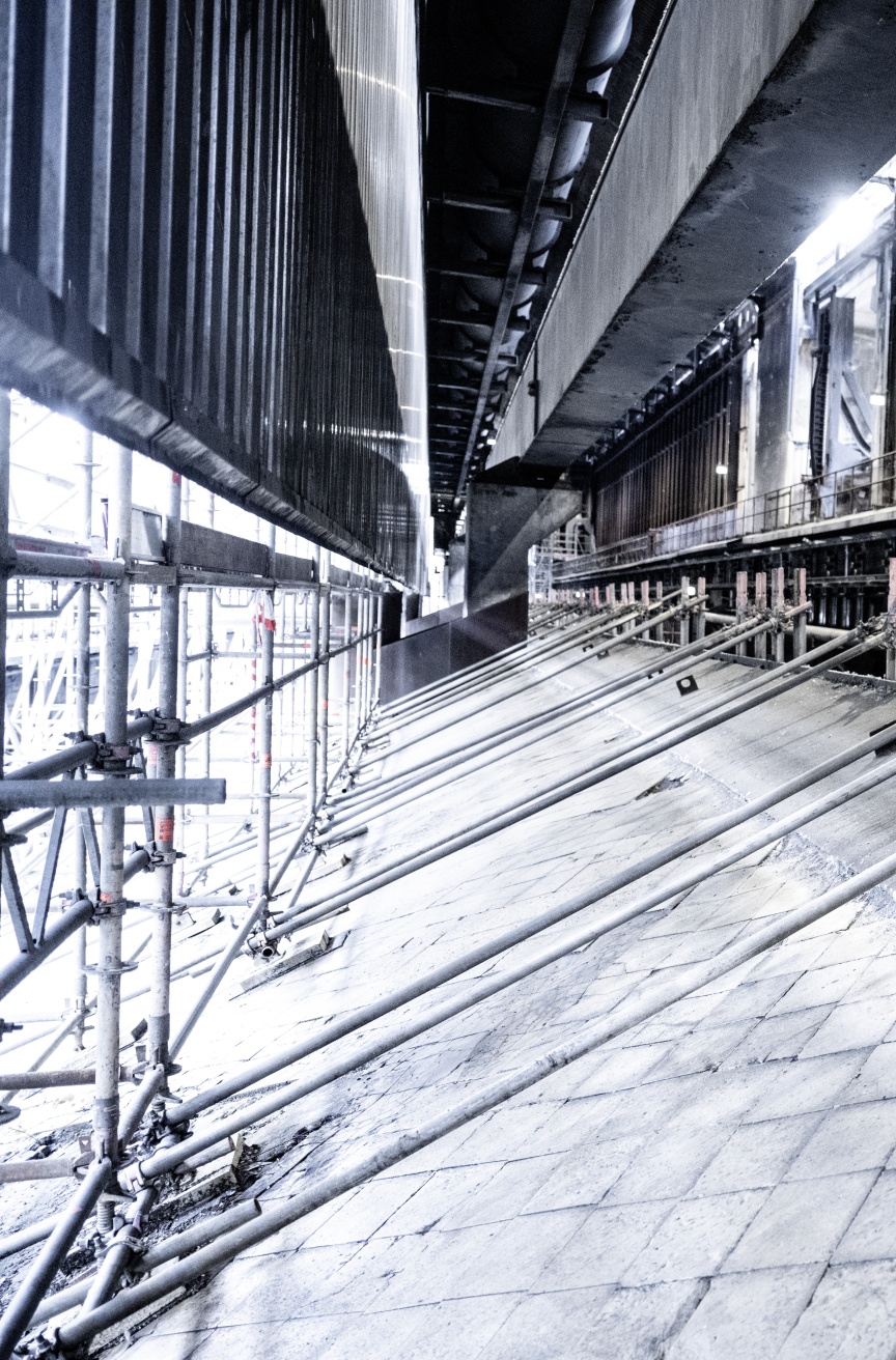 Inside the quenching hall, three birdcage scaffolding elements – each 8,000 m3 in size and completely wrapped in foil plastic sheeting in places for dust protection – were erected one behind the other, creating safe and readily accessible platforms for carrying out the refurbishing work. Once again, the building had a special challenge in store. A so-called hot alley runs at an elevated level parallel to the tracks inside the building, on which huge railway wagons used to transport coke from the ovens to the quenching tower. From here, the person in charge of the coking plant could keep a watch on the entire process route with the help of a small rail car. Unfortunately, the structural properties of the underground were unclear, meaning the birdcage scaffolding was not allowed to be supported on the floor but had to be built on the rails with the help of wooden beams.