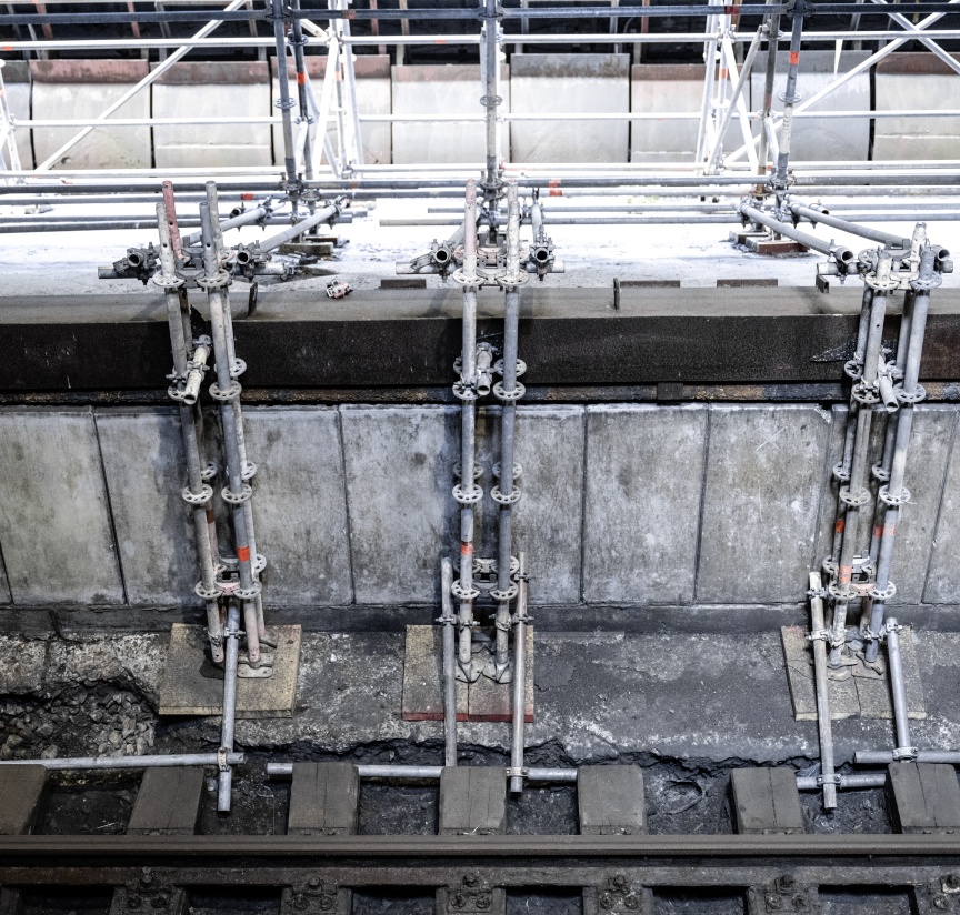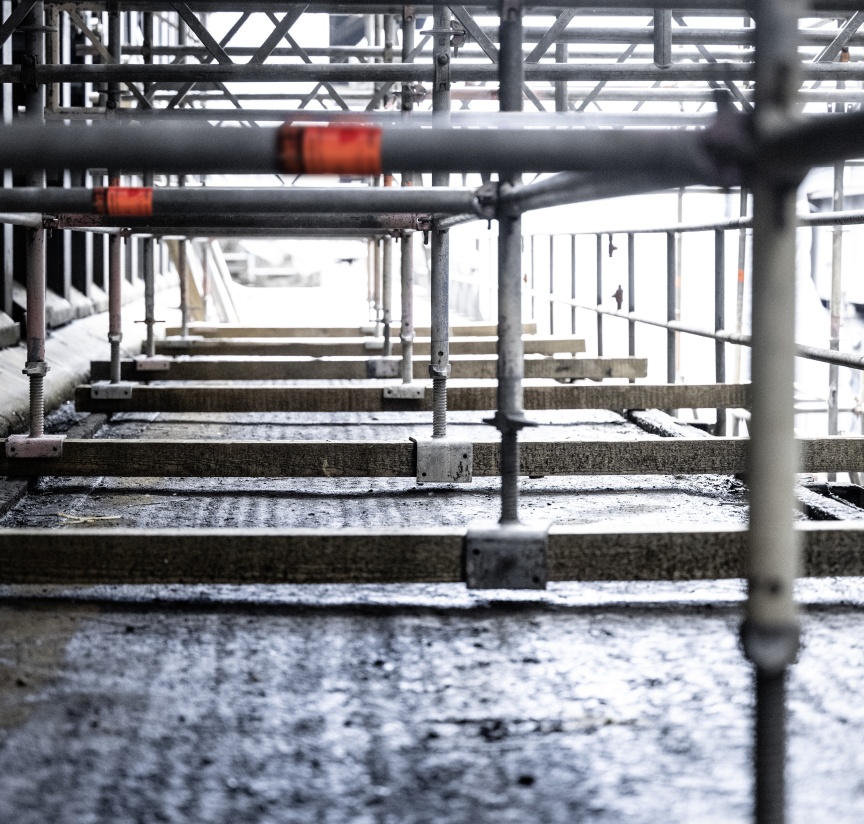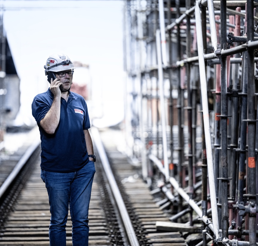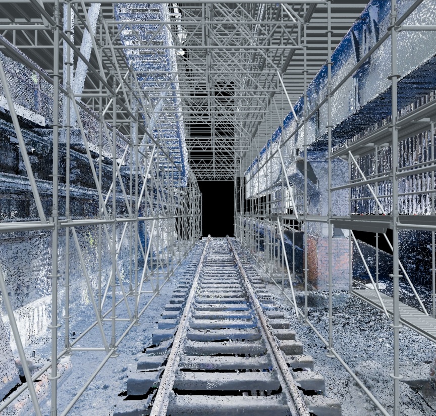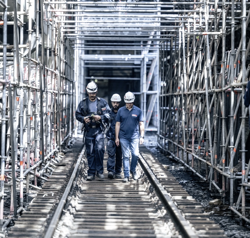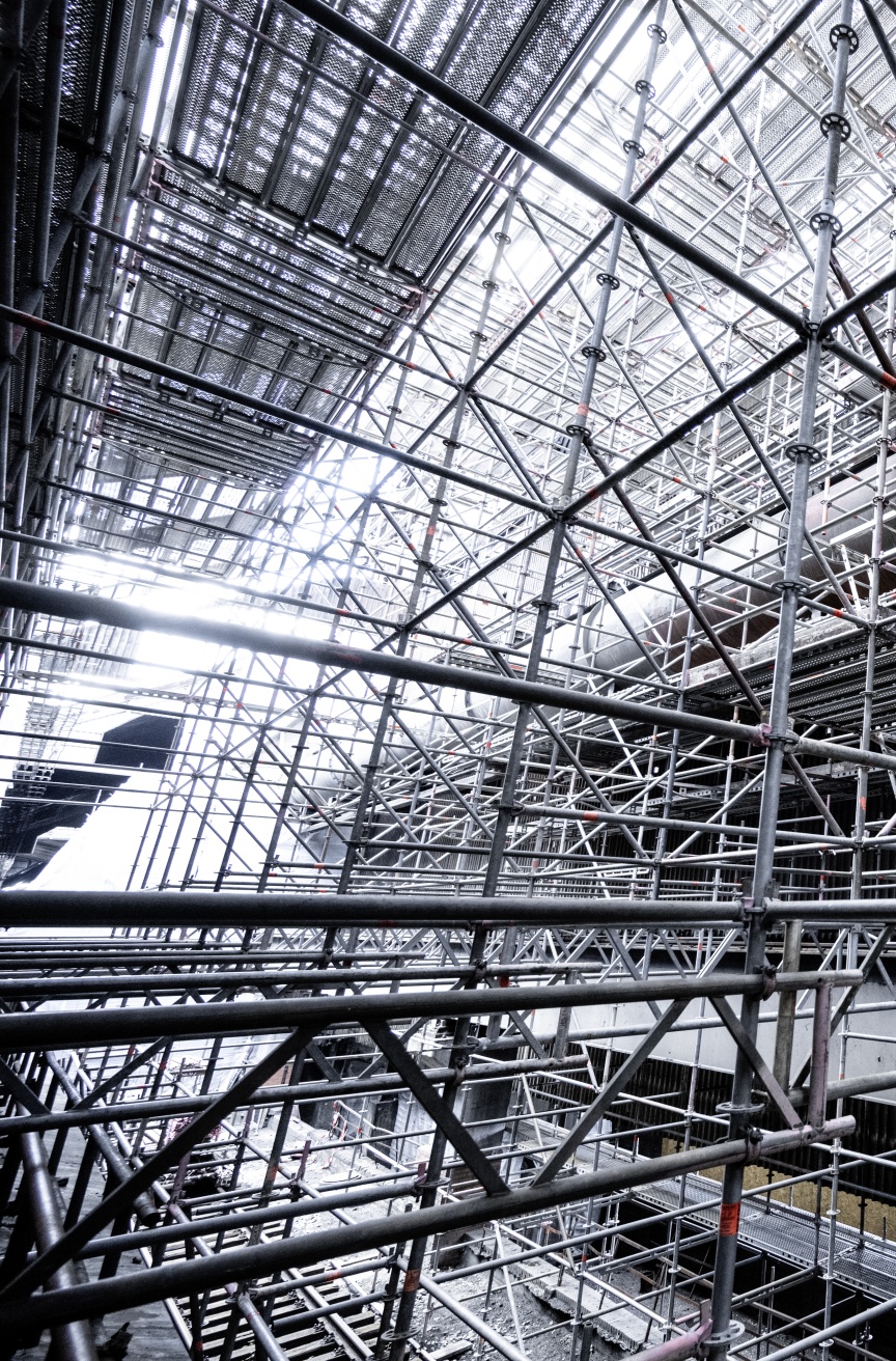Inside the quenching hall, three birdcage scaffolding elements – each 8,000 m3 in size and completely wrapped in foil plastic sheeting in places for dust protection – were erected one behind the other, creating safe and readily accessible platforms for carrying out the refurbishing work. Once again, the building had a special challenge in store. A so-called hot alley runs at an elevated level parallel to the tracks inside the building, on which huge railway wagons used to transport coke from the ovens to the quenching tower. From here, the person in charge of the coking plant could keep a watch on the entire process route with the help of a small rail car. Unfortunately, the structural properties of the underground were unclear, meaning the birdcage scaffolding was not allowed to be supported on the floor but had to be built on the rails with the help of wooden beams.