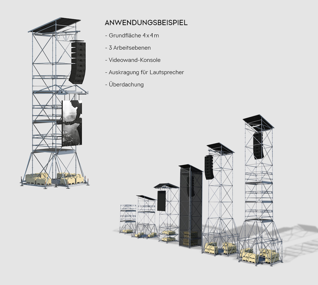 Compared with one-off solutions devised for specific projects, the PA Tower PLUS is both quick to deliver due to the use of Allround standard components and efficient to assemble.