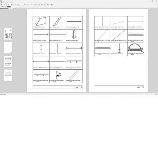 - Detailed information on the scaffolding components (reference number, name, weight, price) including preview image.